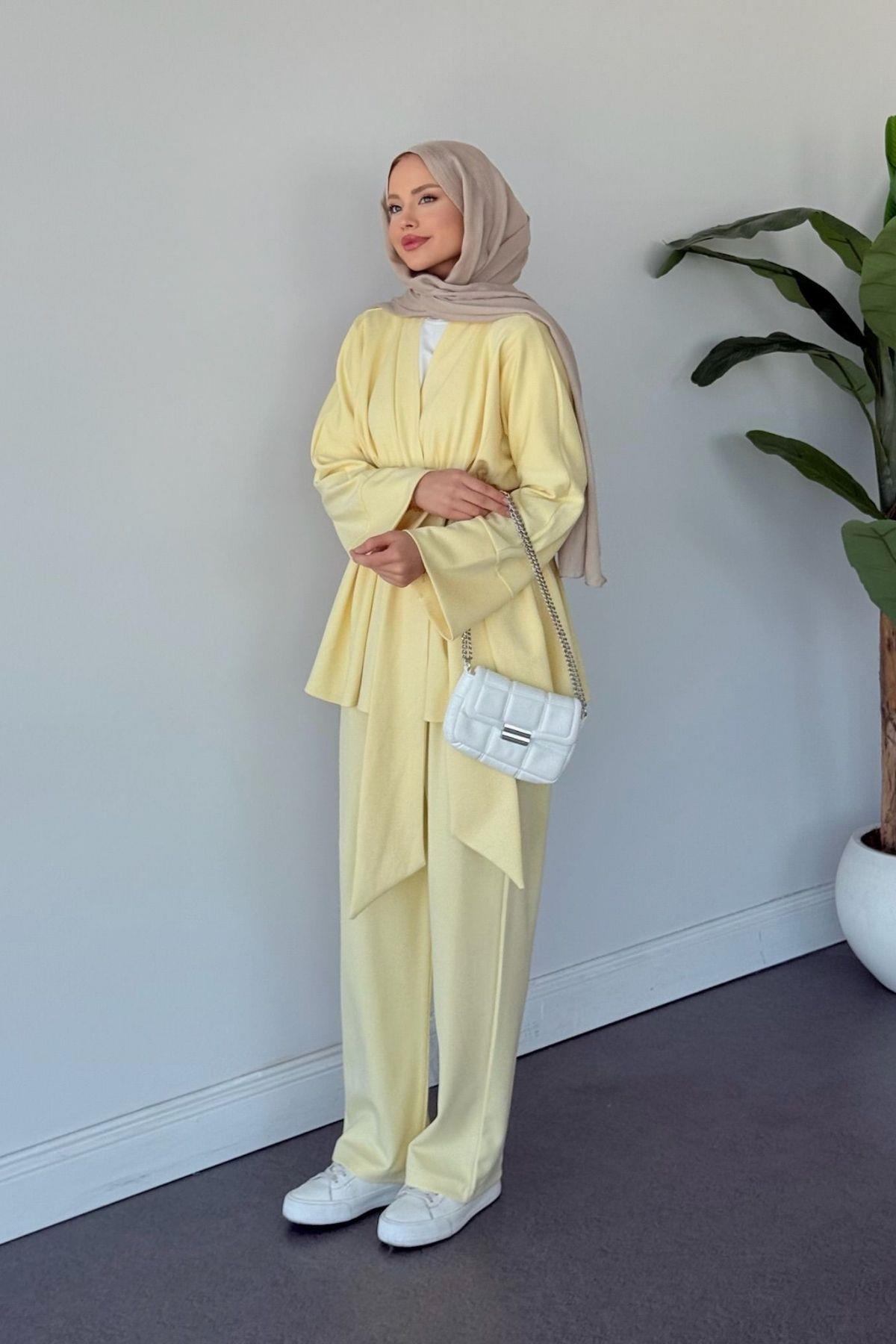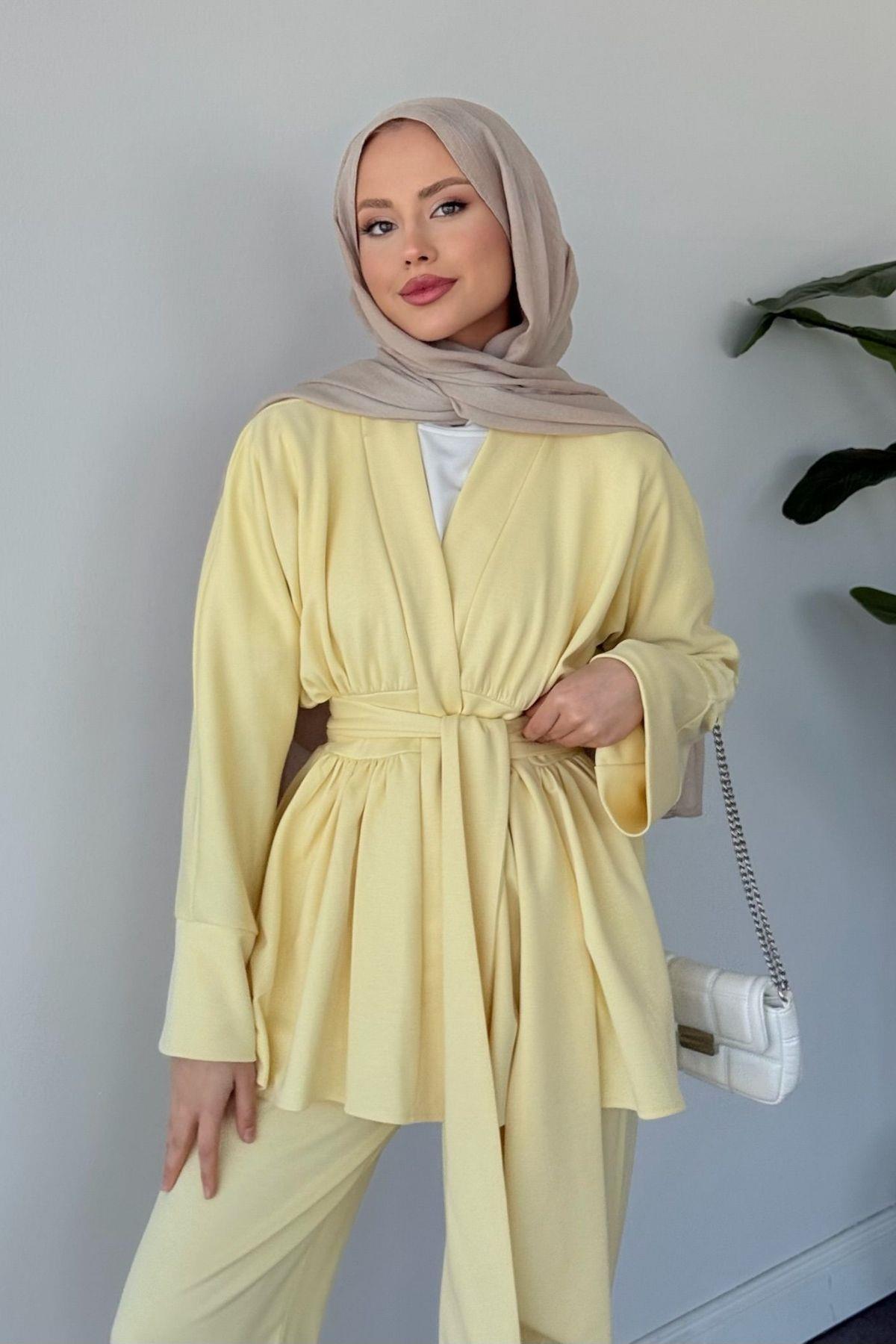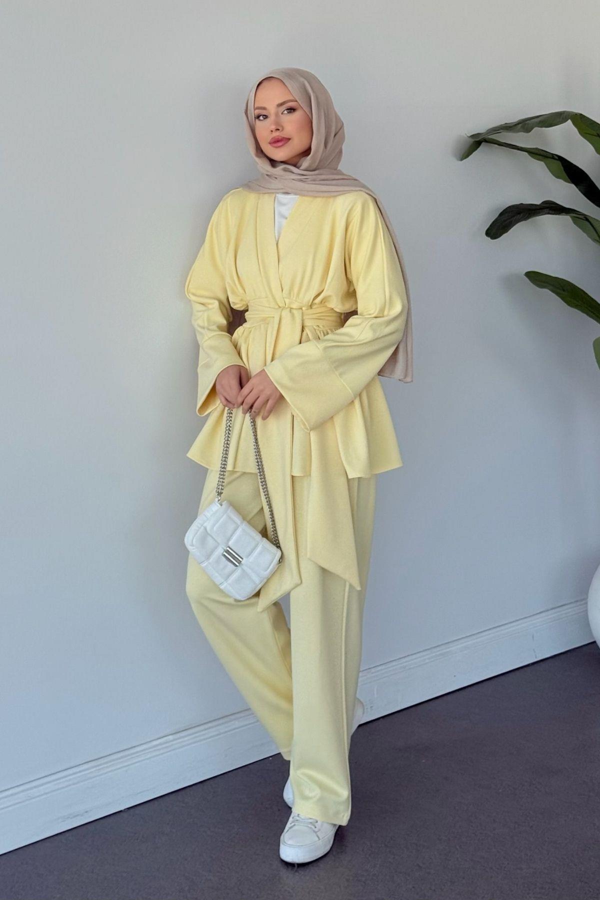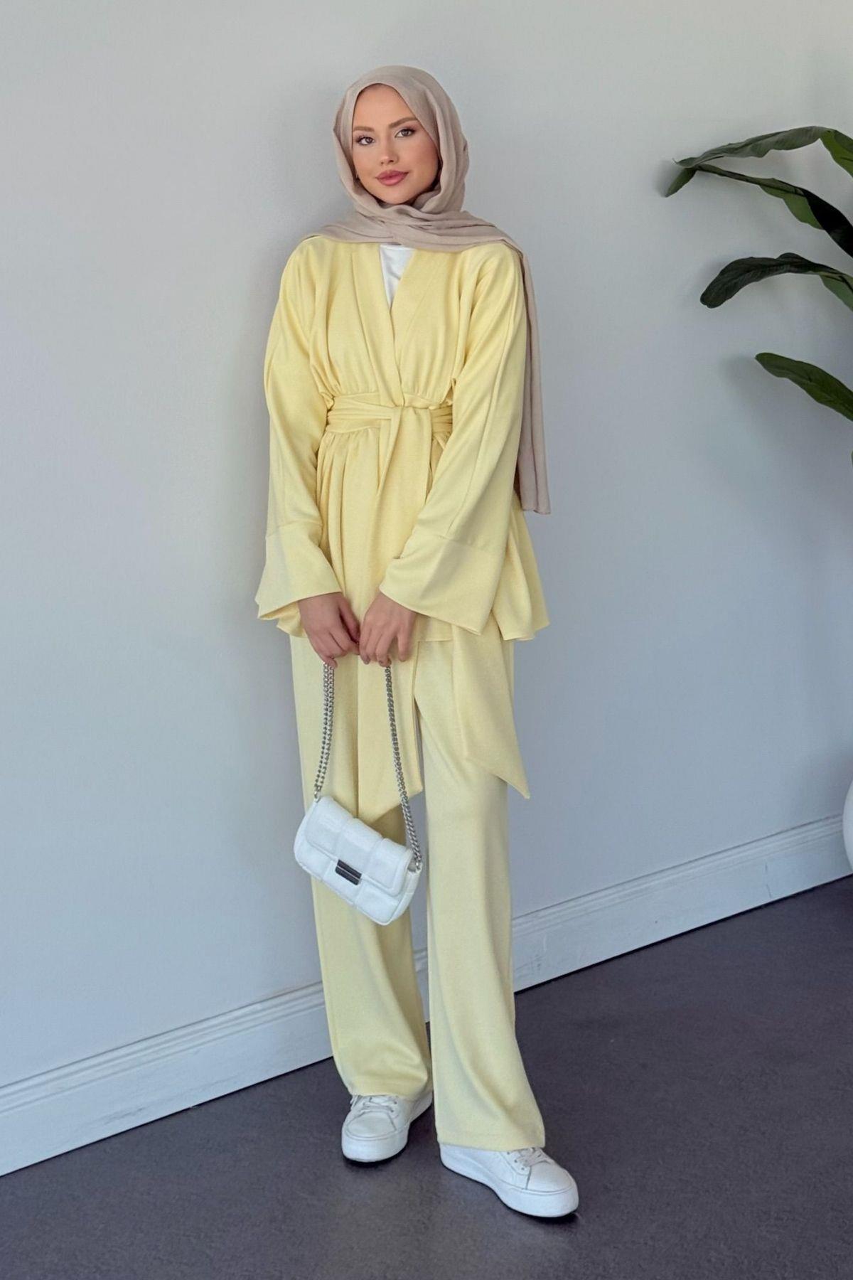 • Üst bluz: Modal kumaştan üretilmiş, kendinden kuşak detaylı bluz