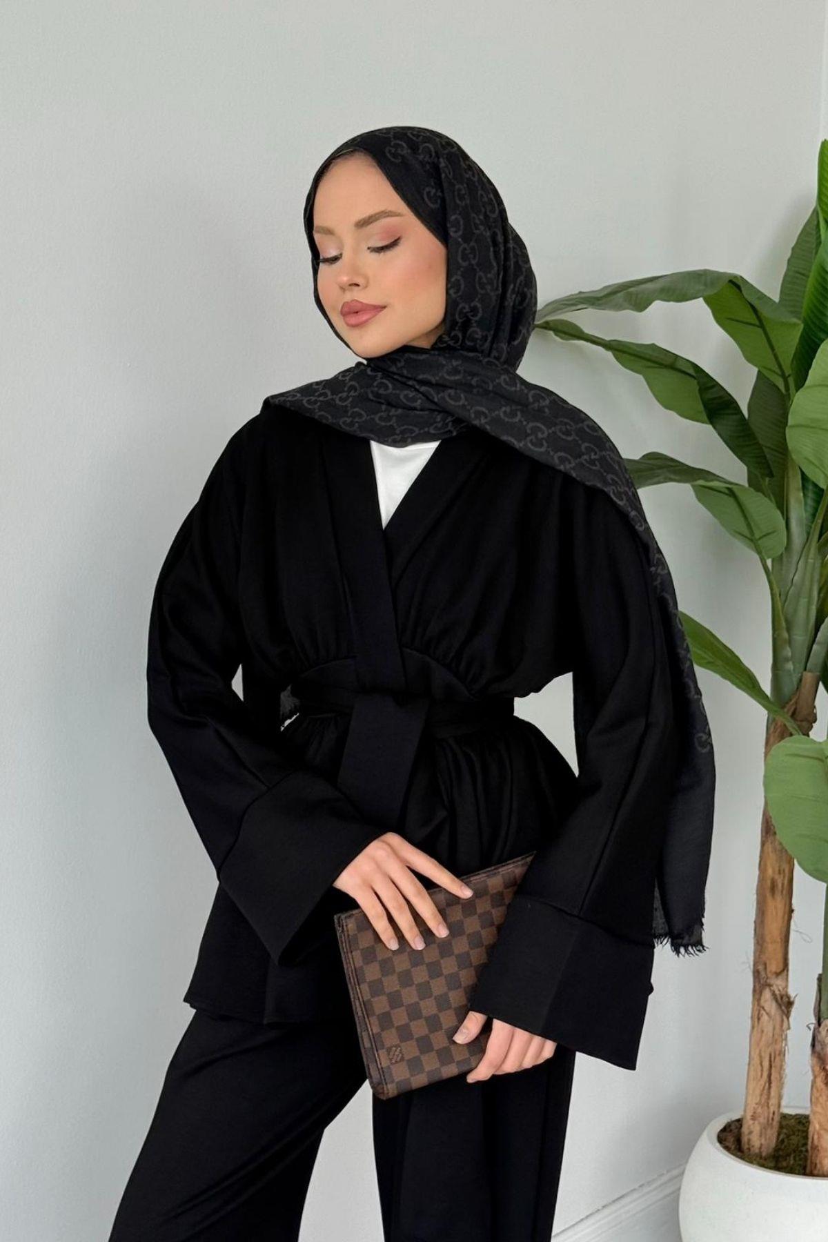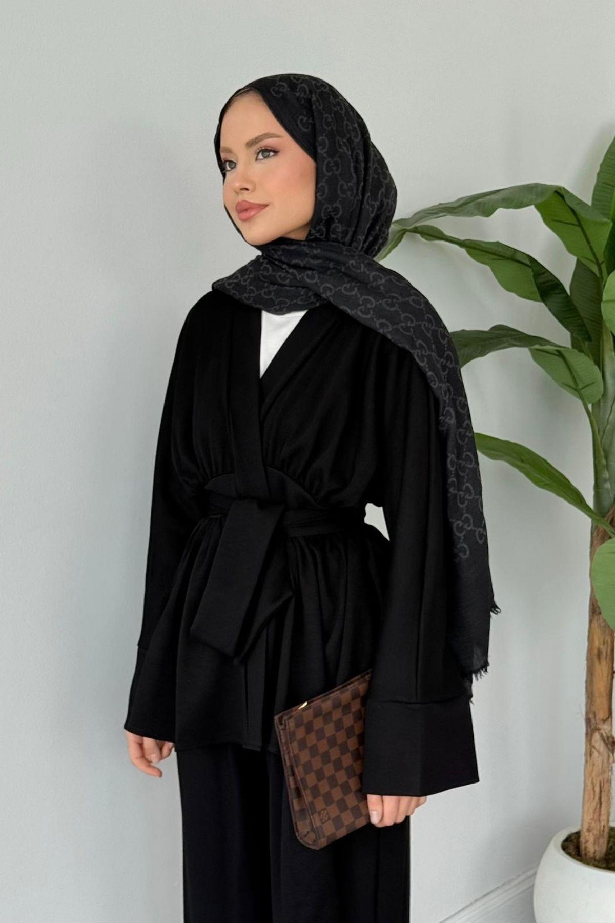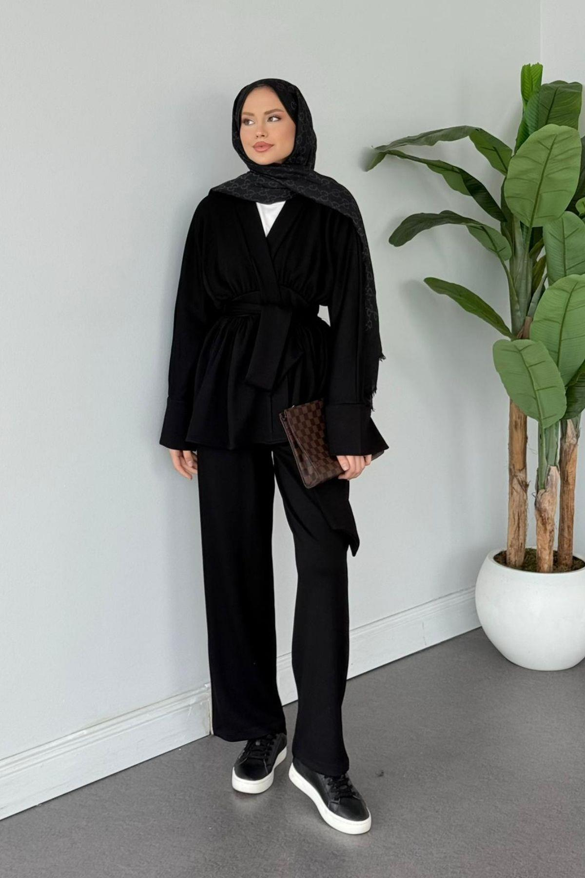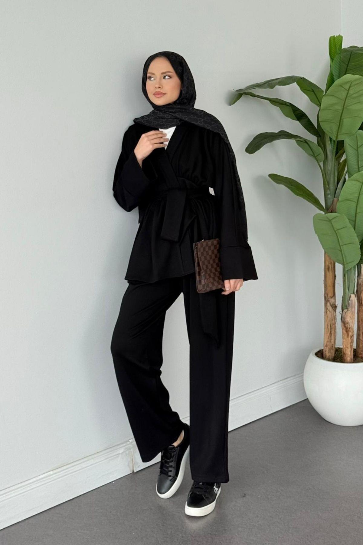 • Üst bluz: Modal kumaştan üretilmiş, kendinden kuşak detaylı bluz