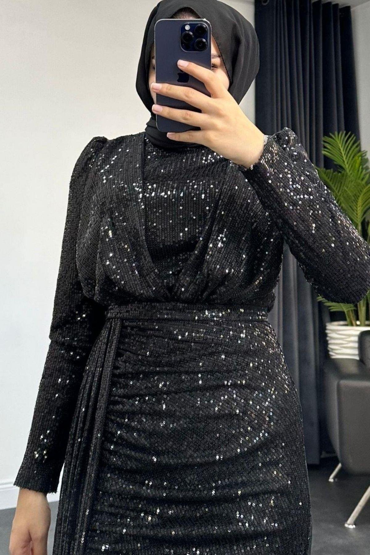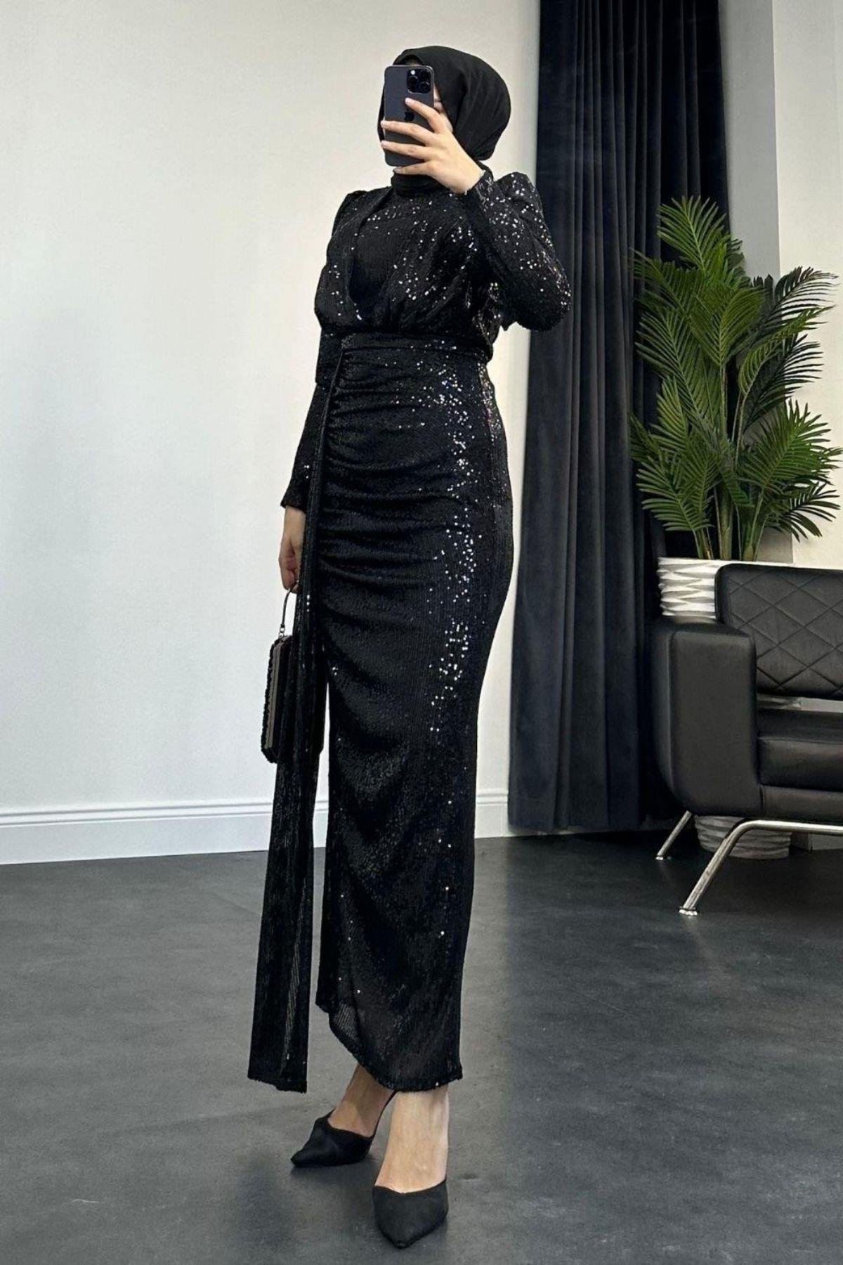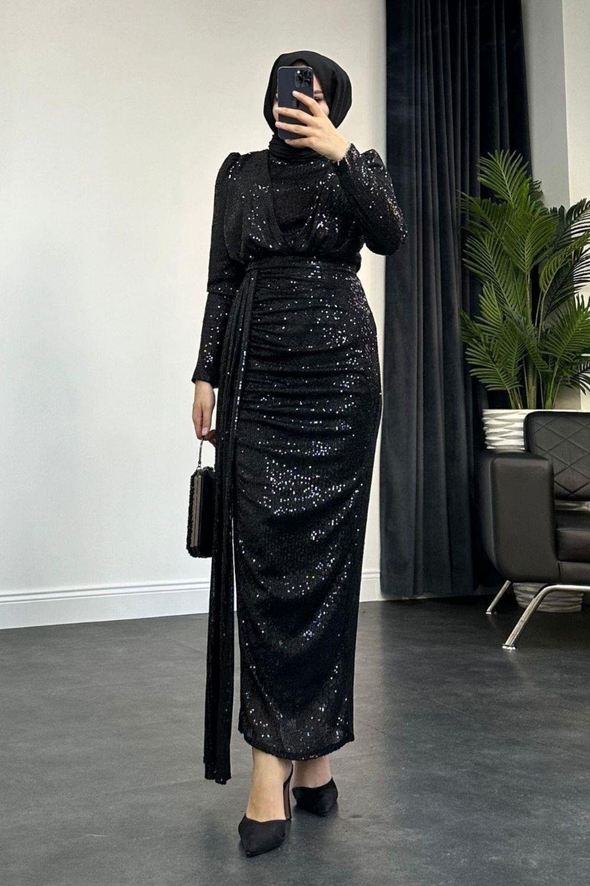 فستان سهرة مطرز بالترتر من Ada باللون الأسود (8547)