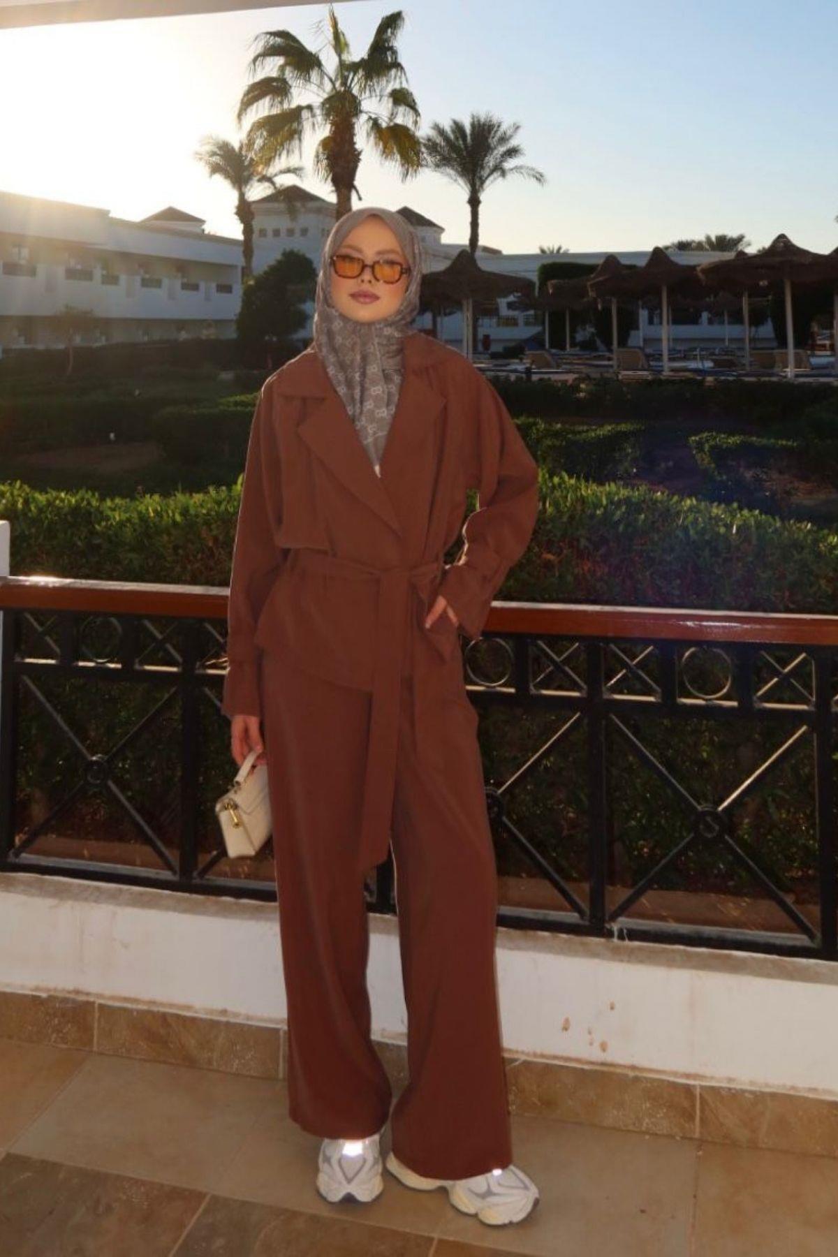 Ürün ikili takımdan oluşmaktadır. Modal kumaştır. Kendinden bi adet kemeri mevcuttur üst formunda kol detayında aplaet mevcuttur pantolon beli lastiklidir.
