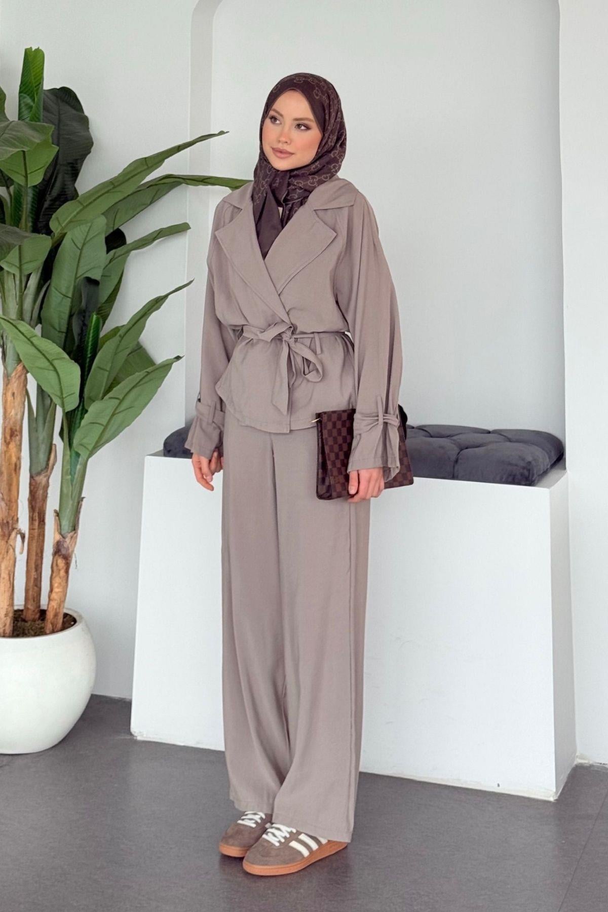 Ürün ikili takımdan oluşmaktadır. Modal kumaştır. Kendinden bi adet kemeri mevcuttur üst formunda kol detayında aplaet mevcuttur pantolon beli lastiklidir.