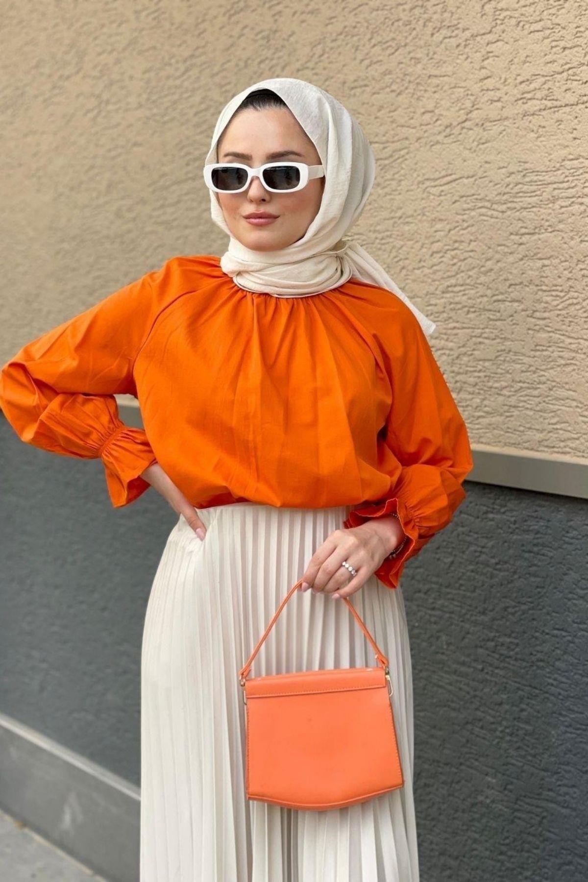 تونيك حجاب من البوبلين بأكمام مطاطية برتقالي (8582)