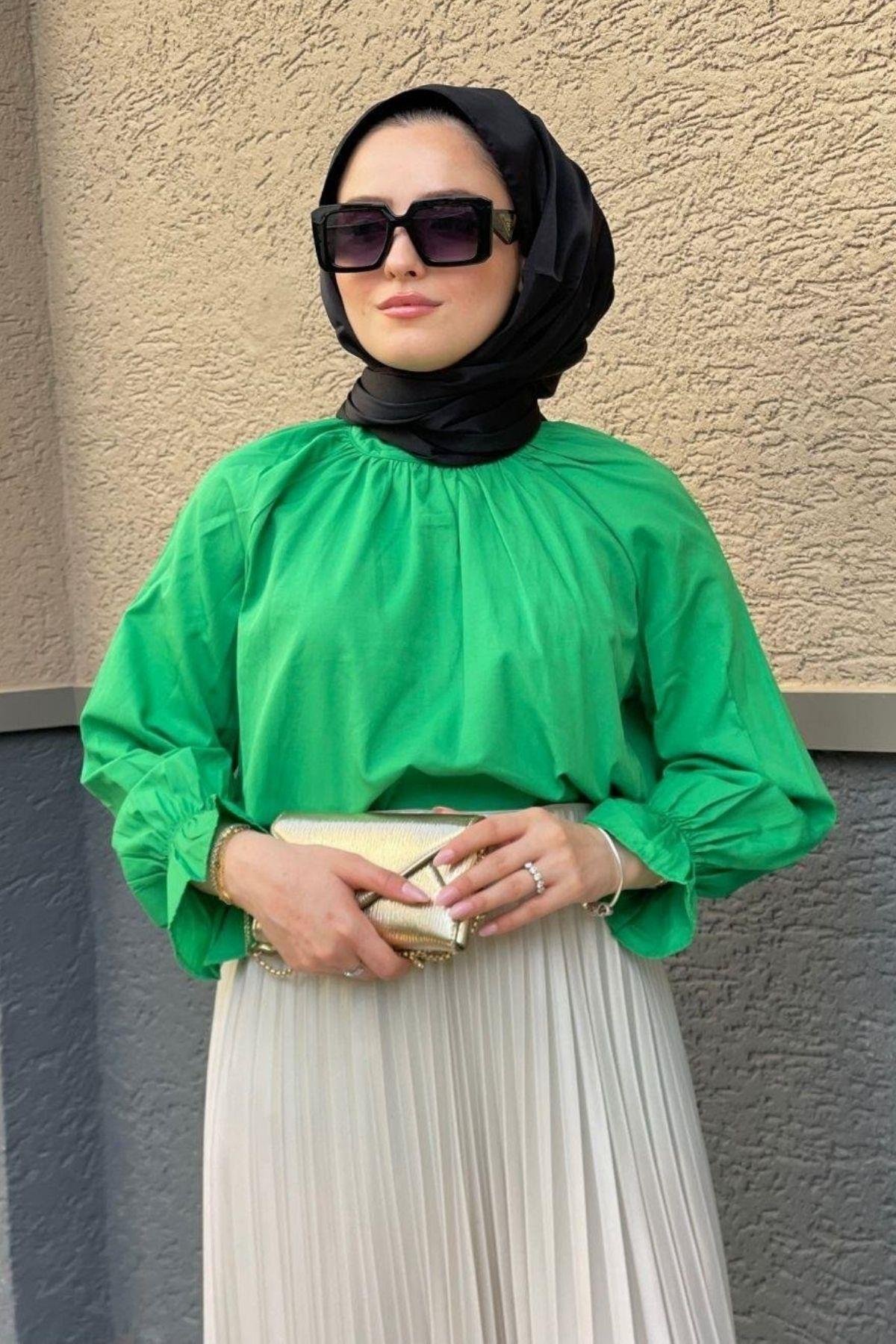 تونيك حجاب من البوبلين بأكمام مطاطية باللون الأخضر (8582)