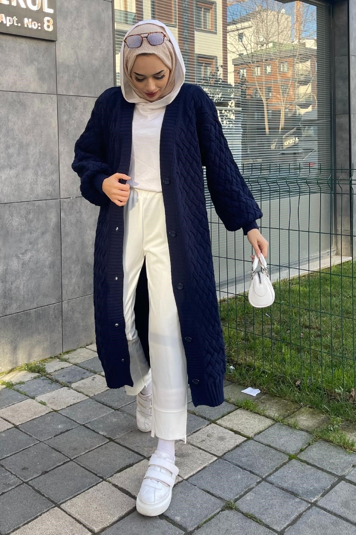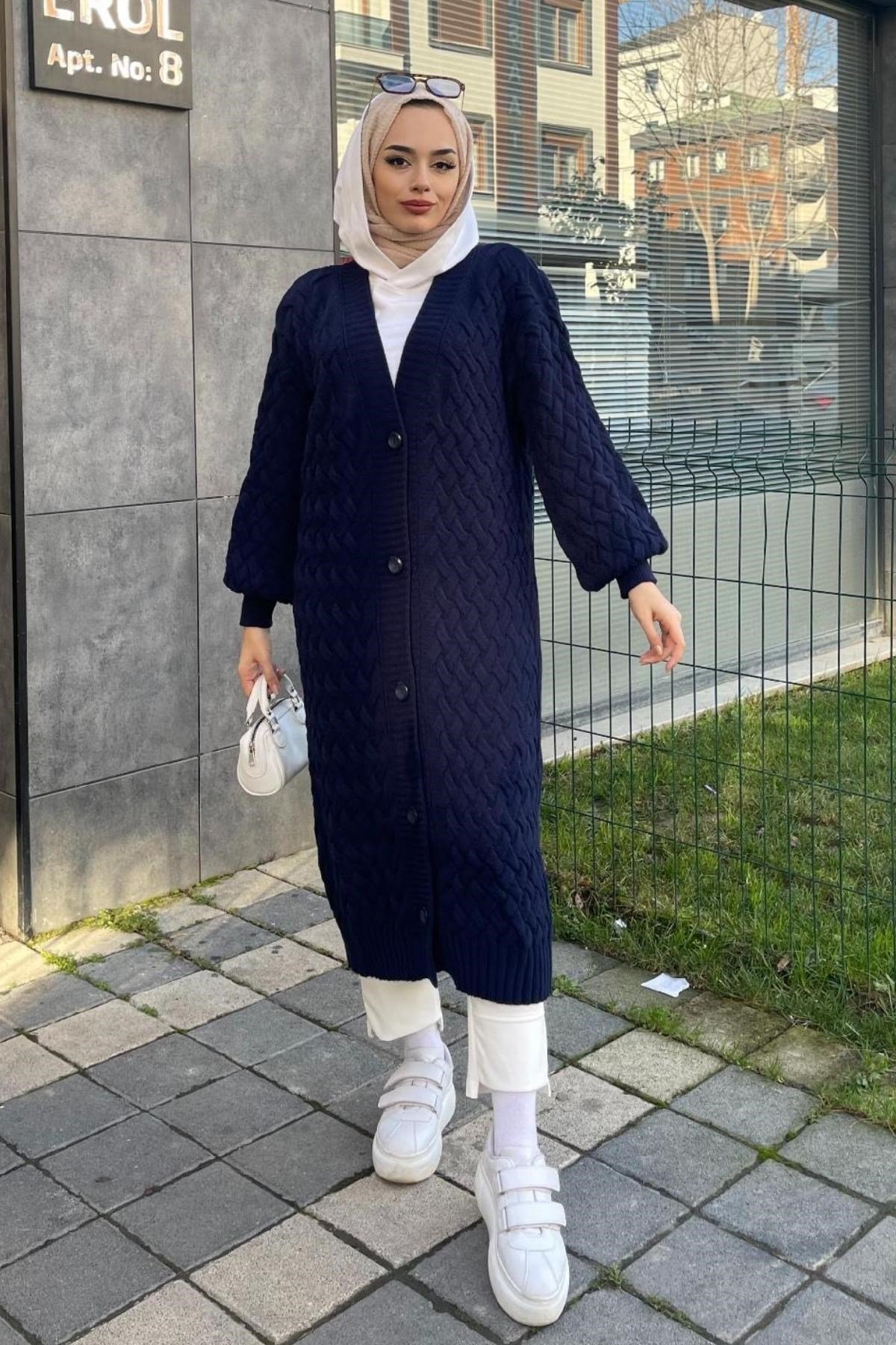 سترة طويلة محبوكة باللون الأزرق الداكن (8249)