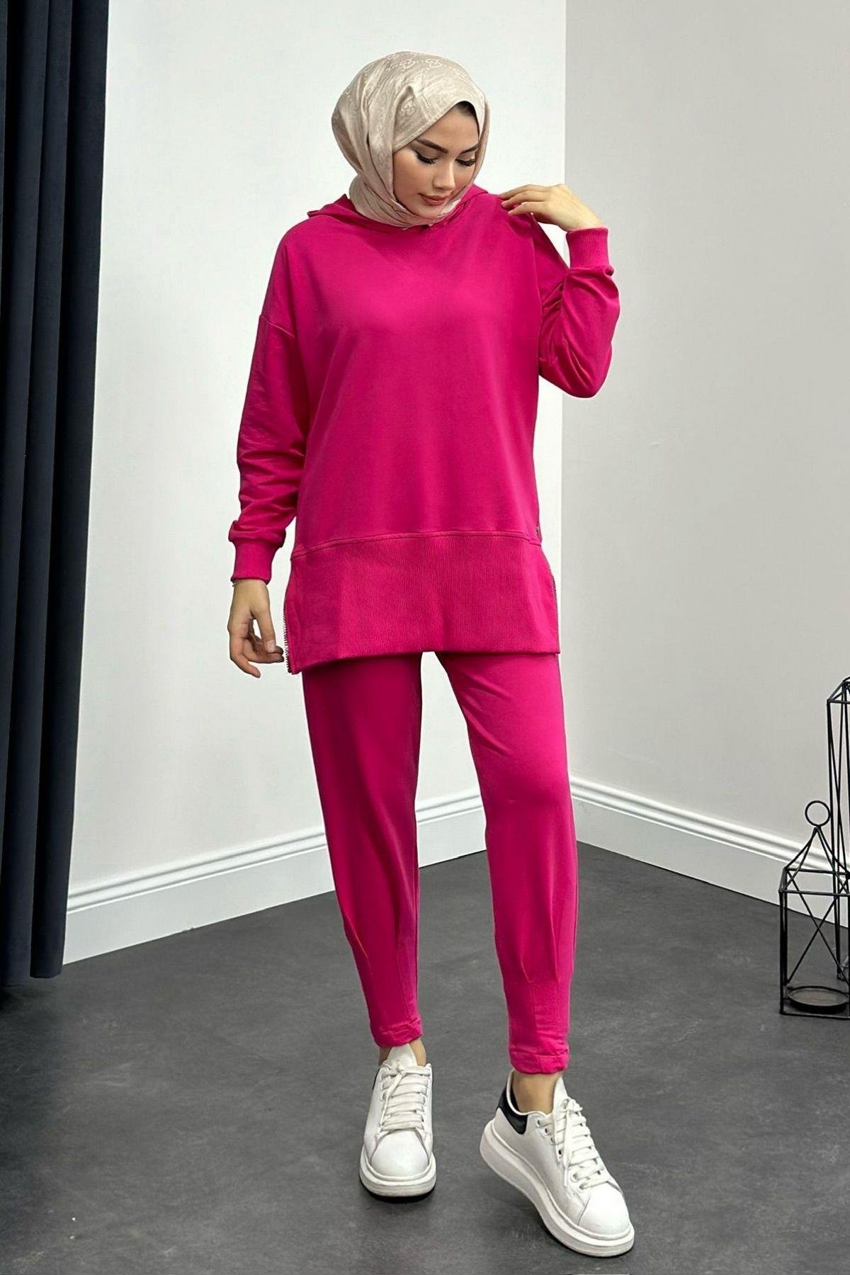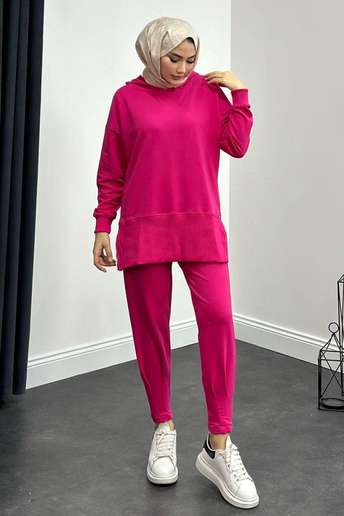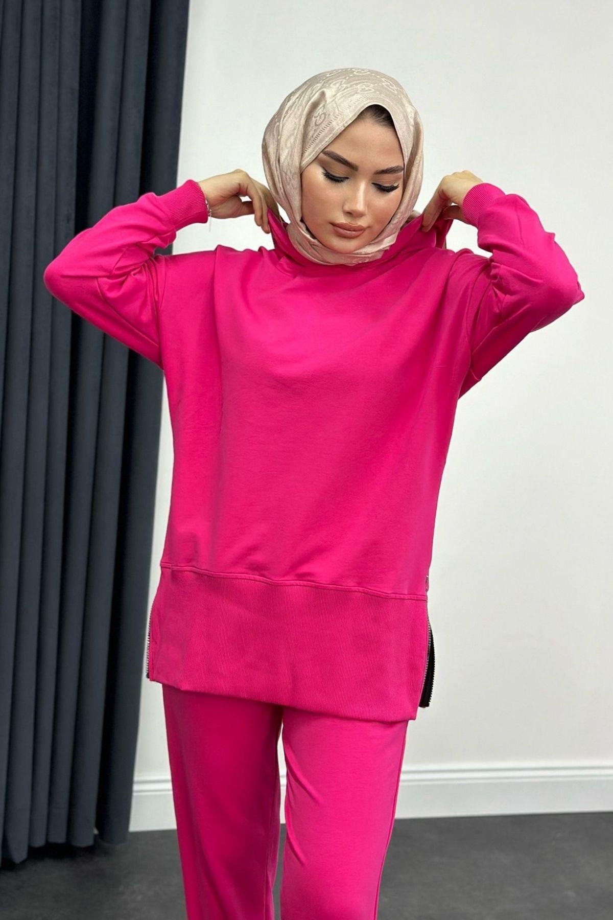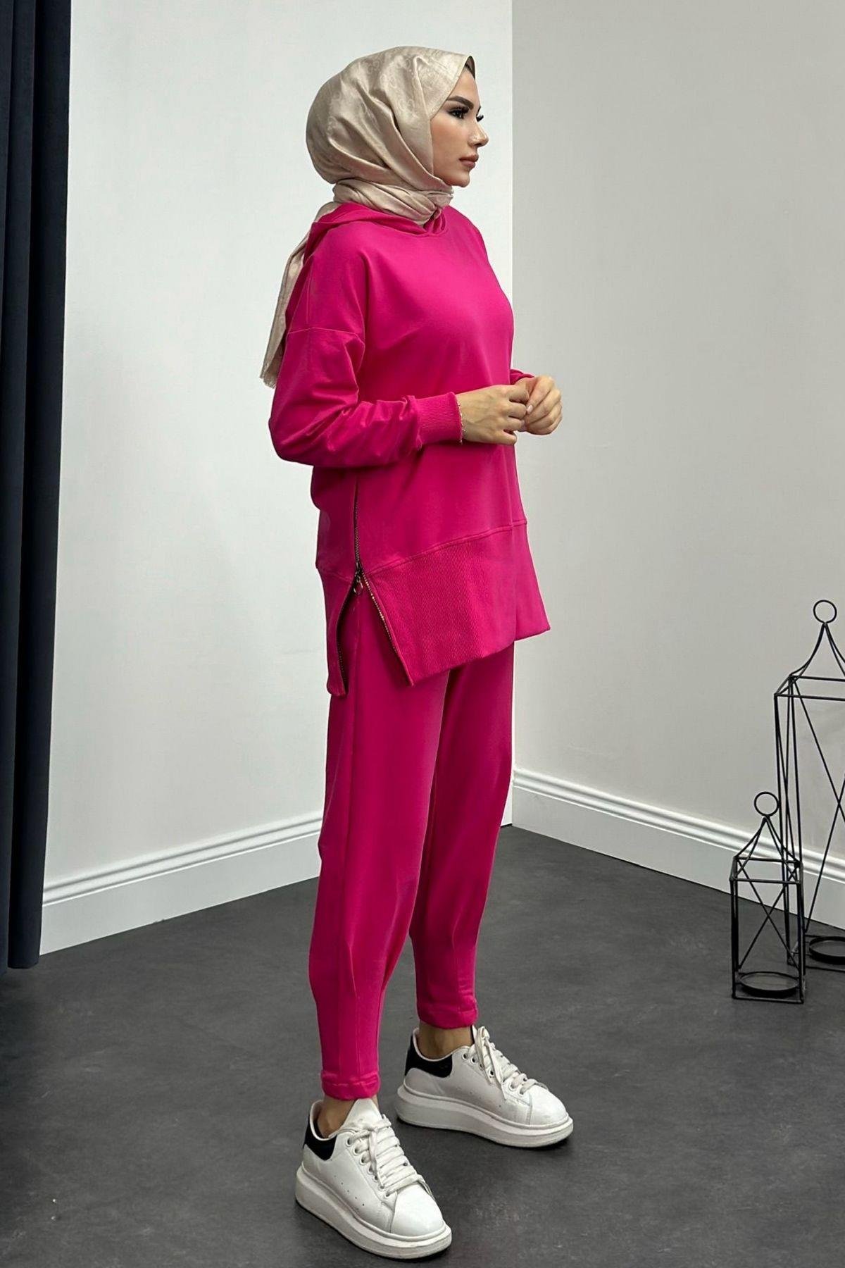طقم بدلة رياضية بسحاب جانبي باللون الفوشيا (8592)