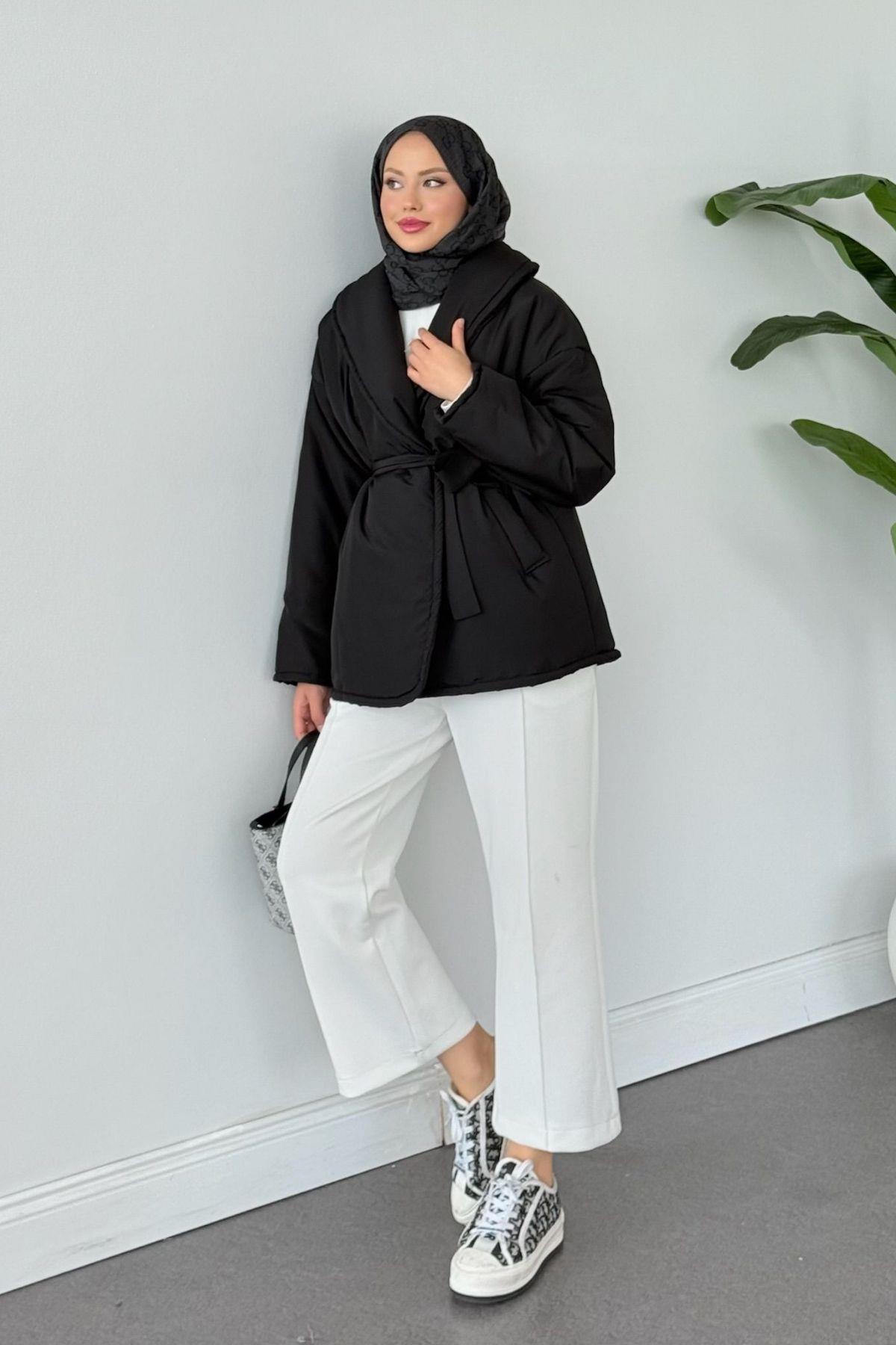 Düz Kuşaklı Şişme Mont Siyah (5912)