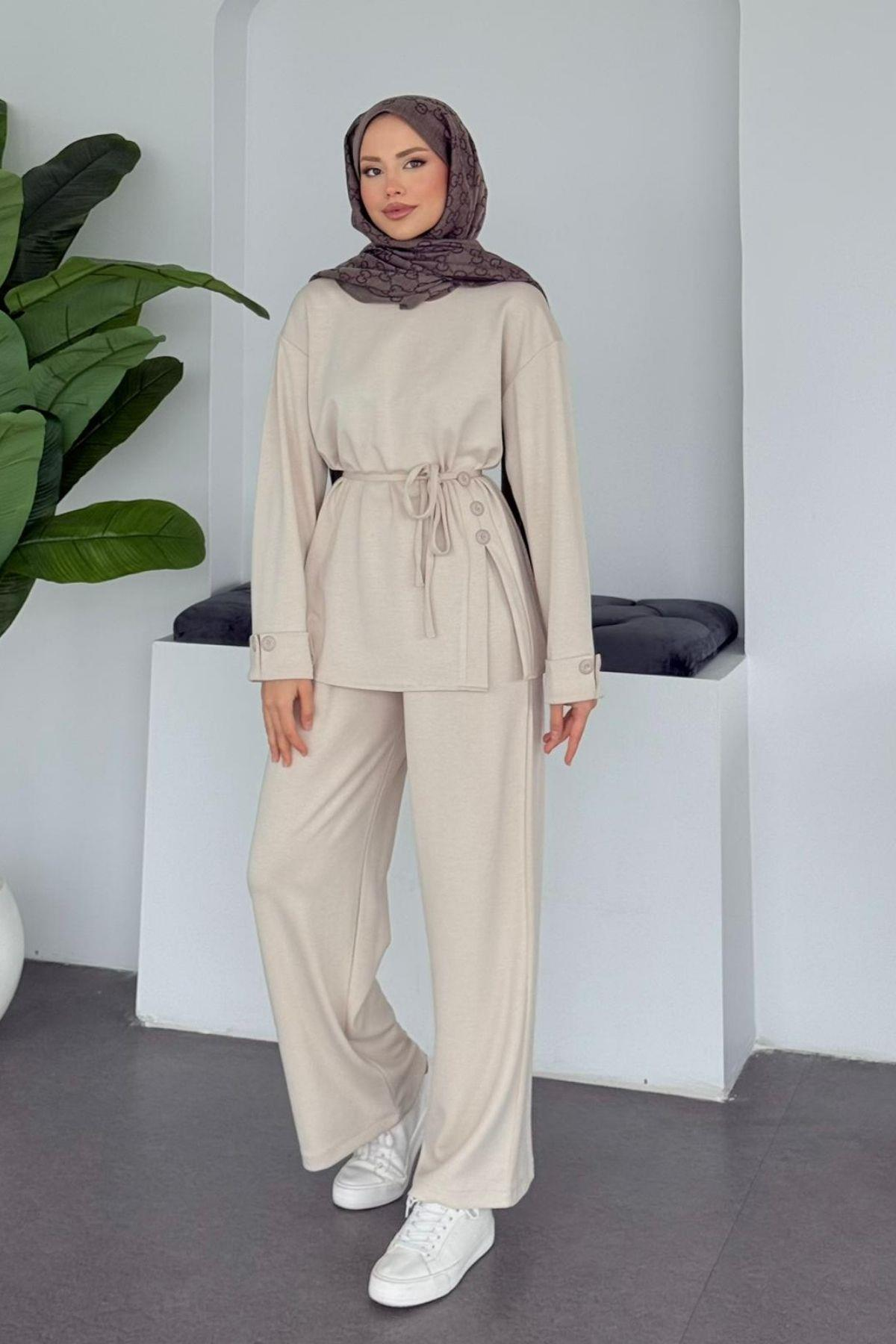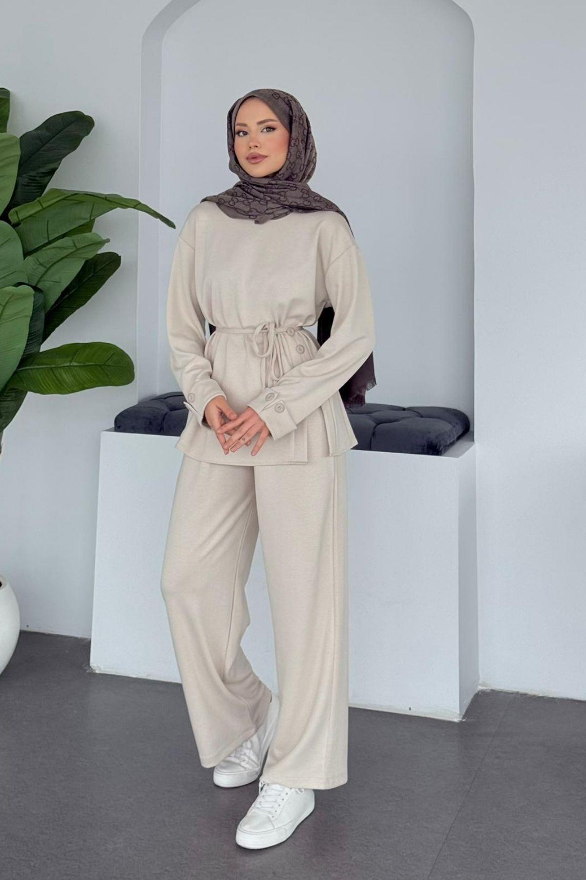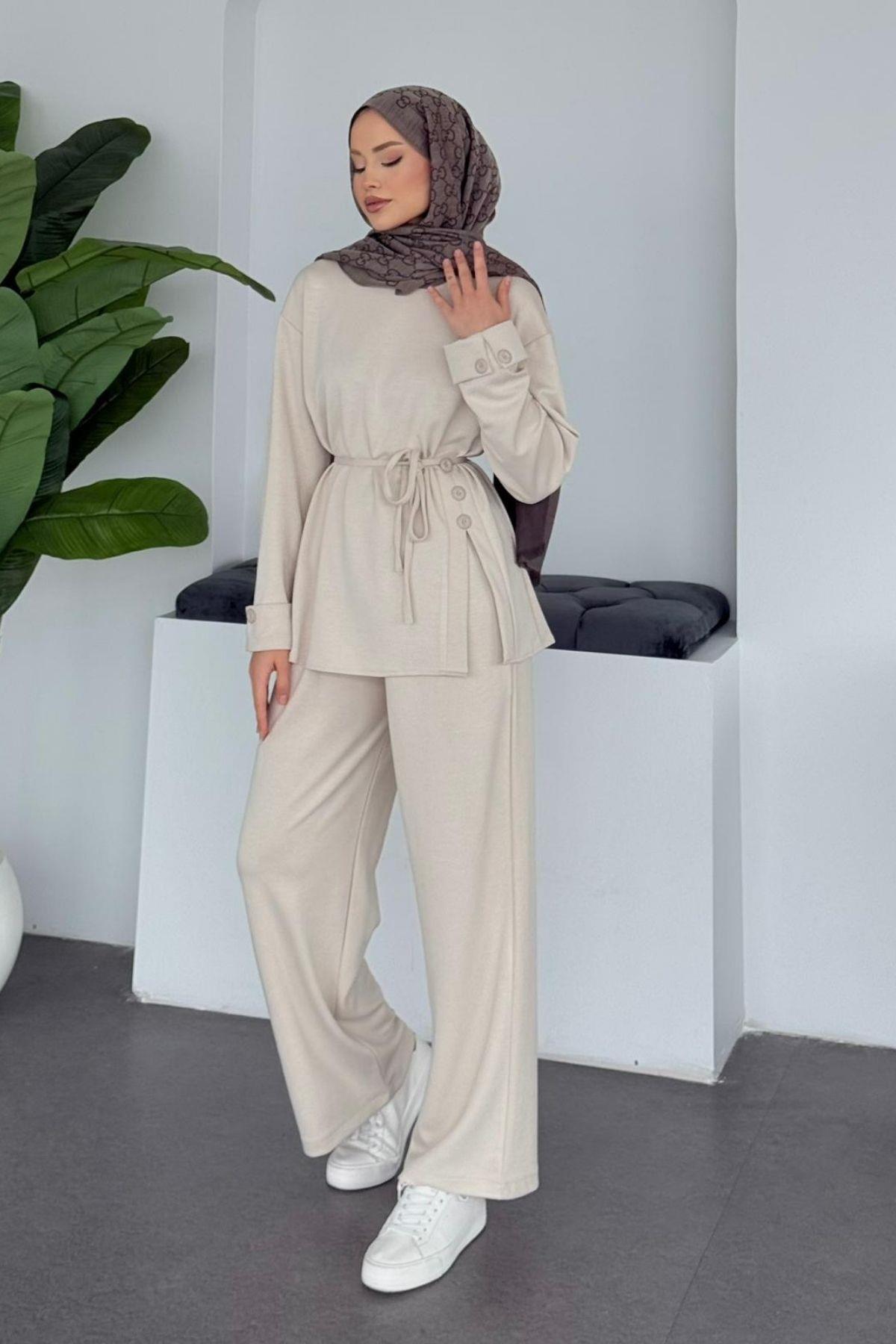 Ürün modal pamuklu kumaştır. İkili takımdan oluşmaktadır bir adet seyar kuşağı mevcuttur ürün üst formunda kol ve yan dikiş kısmında düğme detayları mevcuttur