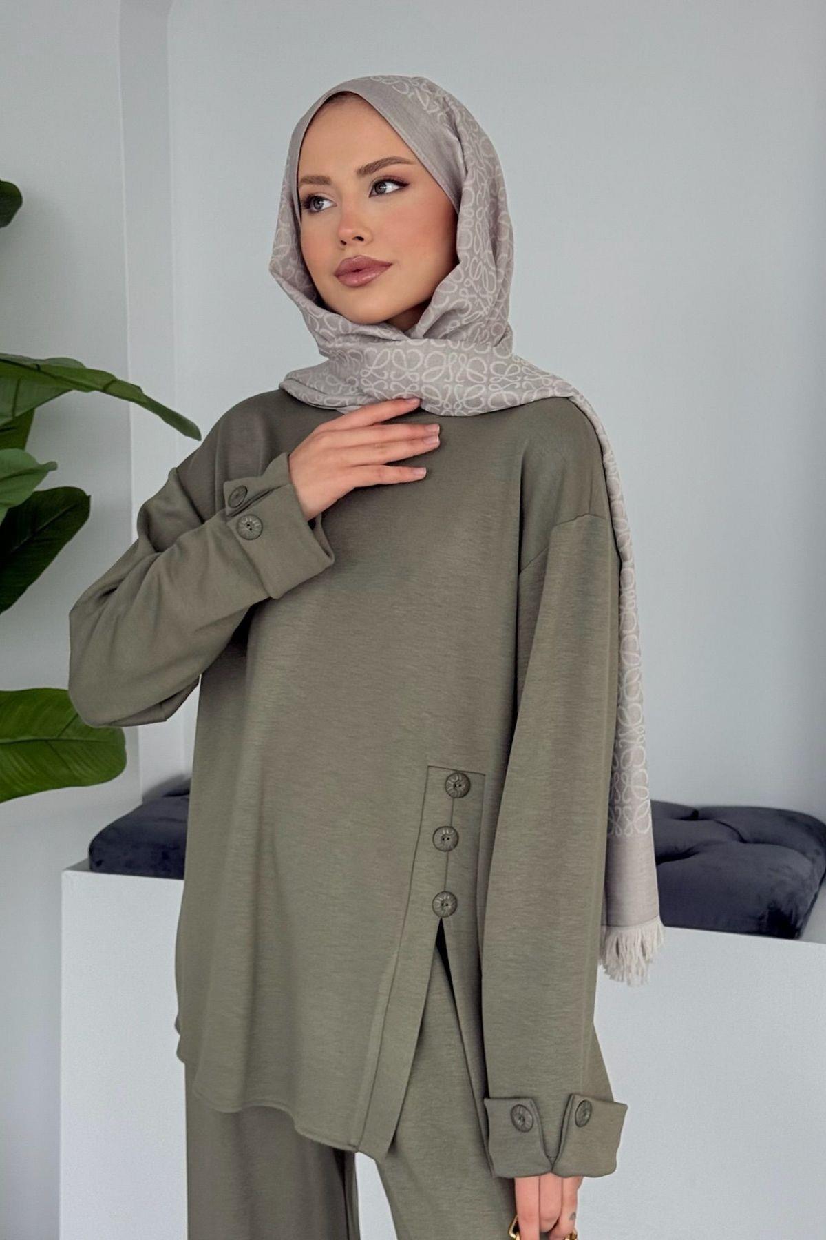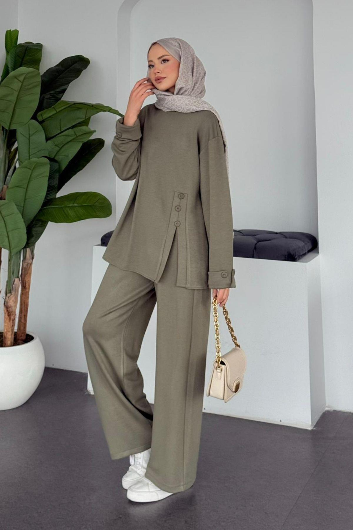 Ürün modal pamuklu kumaştır. İkili takımdan oluşmaktadır bir adet seyar kuşağı mevcuttur ürün üst formunda kol ve yan dikiş kısmında düğme detayları mevcuttur