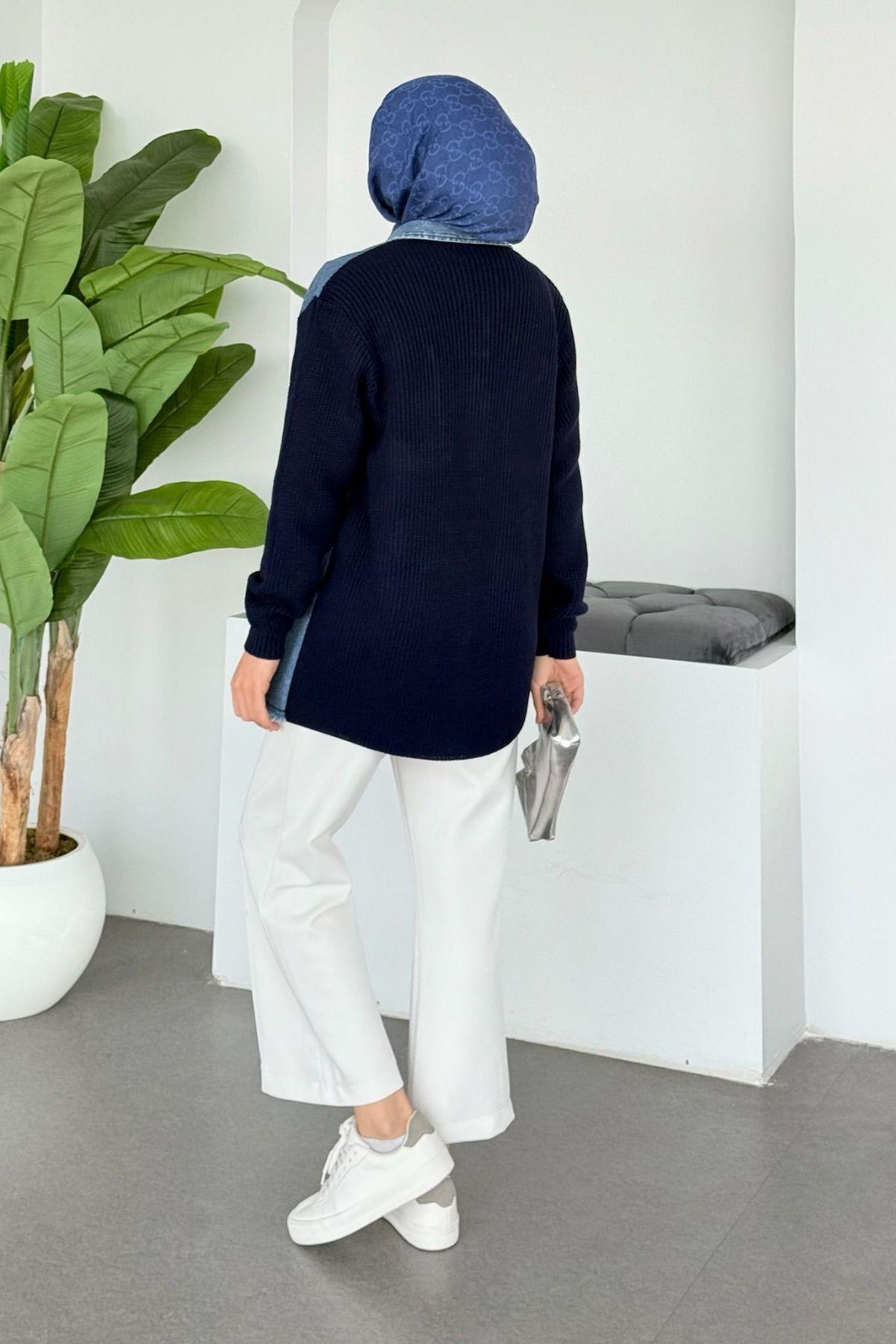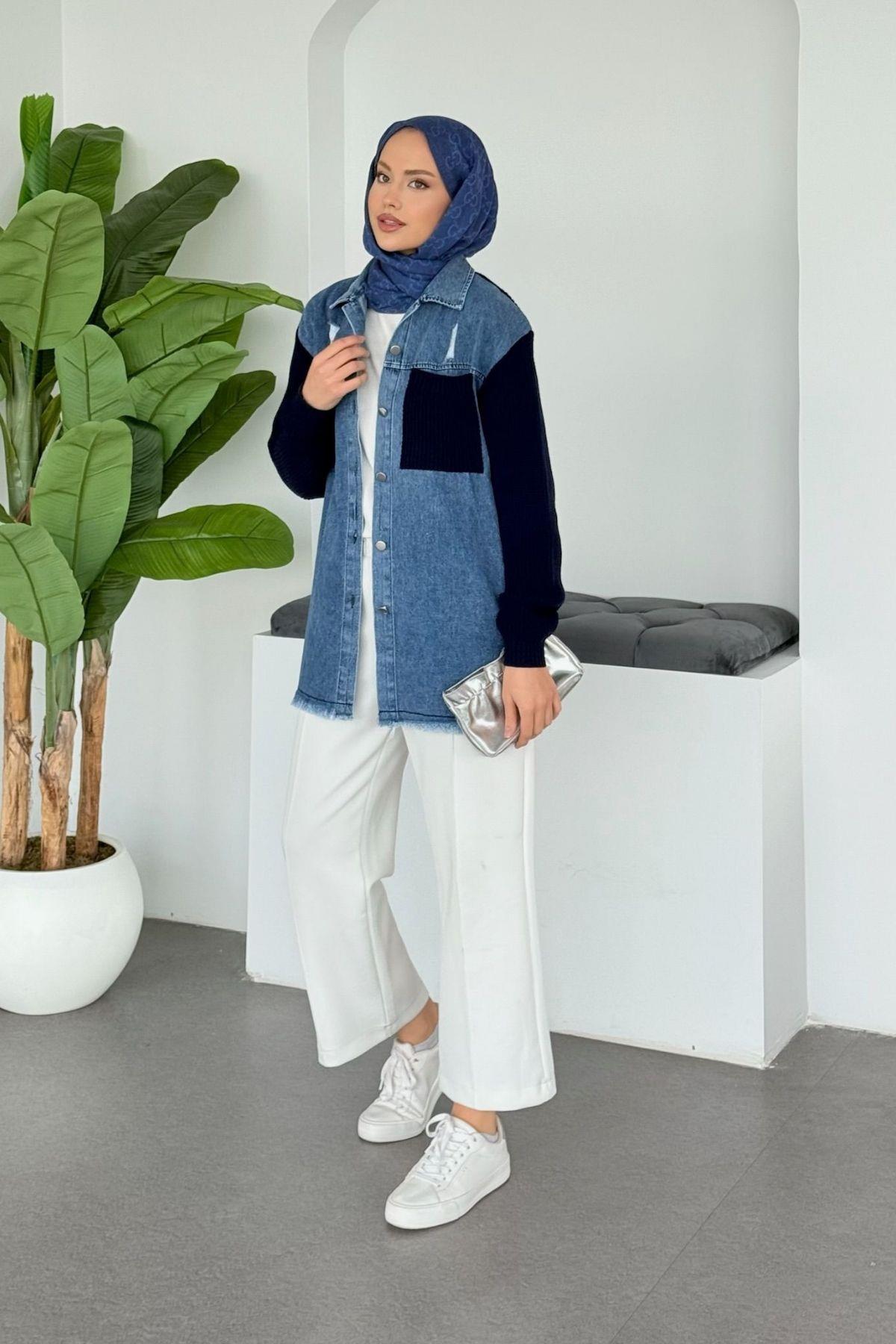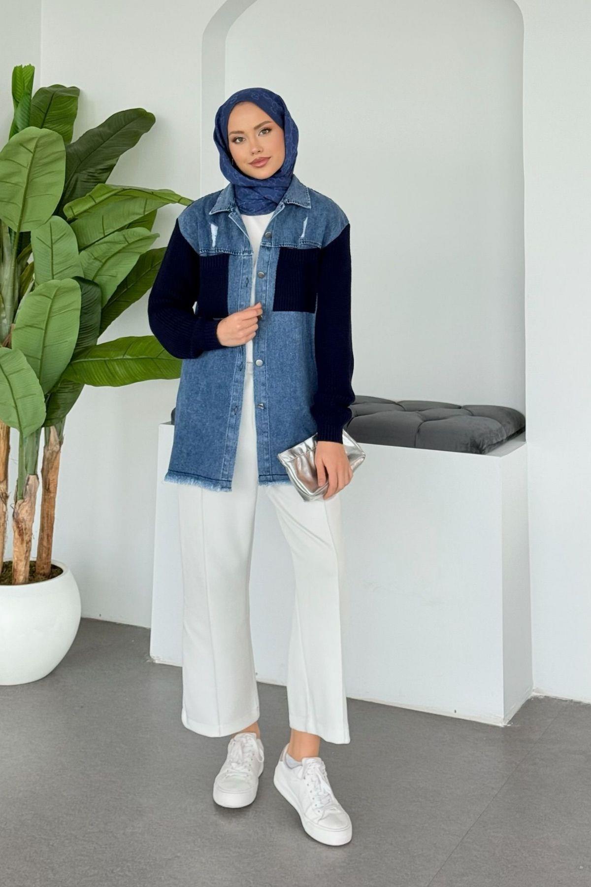 Ürün adı-demo jean hırka Ürün kodu-25260 Ürün ebat-75 Beden aralığı-standart Ürün ön formu kottur. Arka ve kol kısmı trikodur ön formunda düğme detayı mevcuttur.