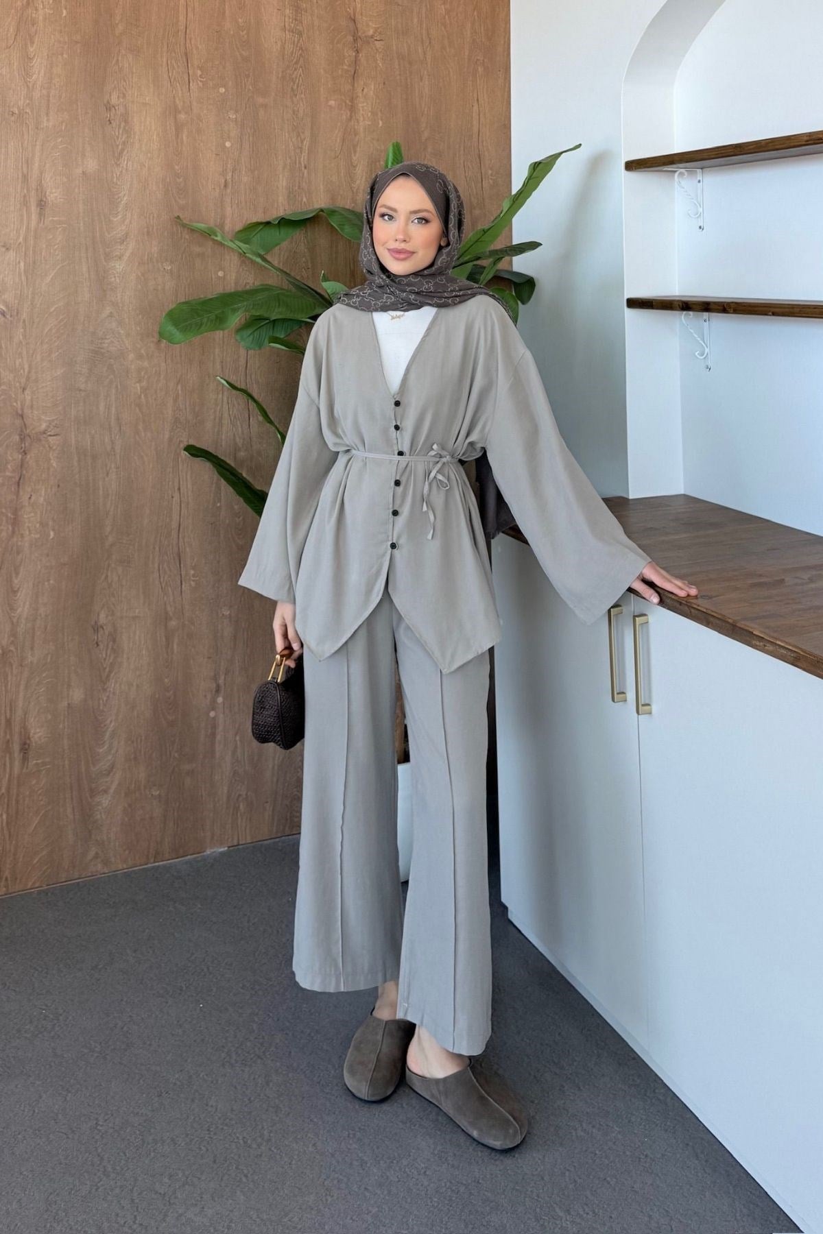 Esra Düğmeli Modal Takım, rahatlığı ve şıklığı bir arada sunan mükemmel bir günlük kombin seçeneğidir. Ön düğme detaylı üst kısmı ve lastikli beliyle konforlu bir pantolondan oluşan bu takım, modal kumaşının yumuşak dokusu sayesinde tüm gün boyunca mükemmel bir his sunar. Hem evde rahatlıkla hem de günlük dış mekan aktivitelerinde şık bir tercih olacak bu takım, minimal ve modern çizgileriyle gardırobunuzun vazgeçilmezi olmaya aday.