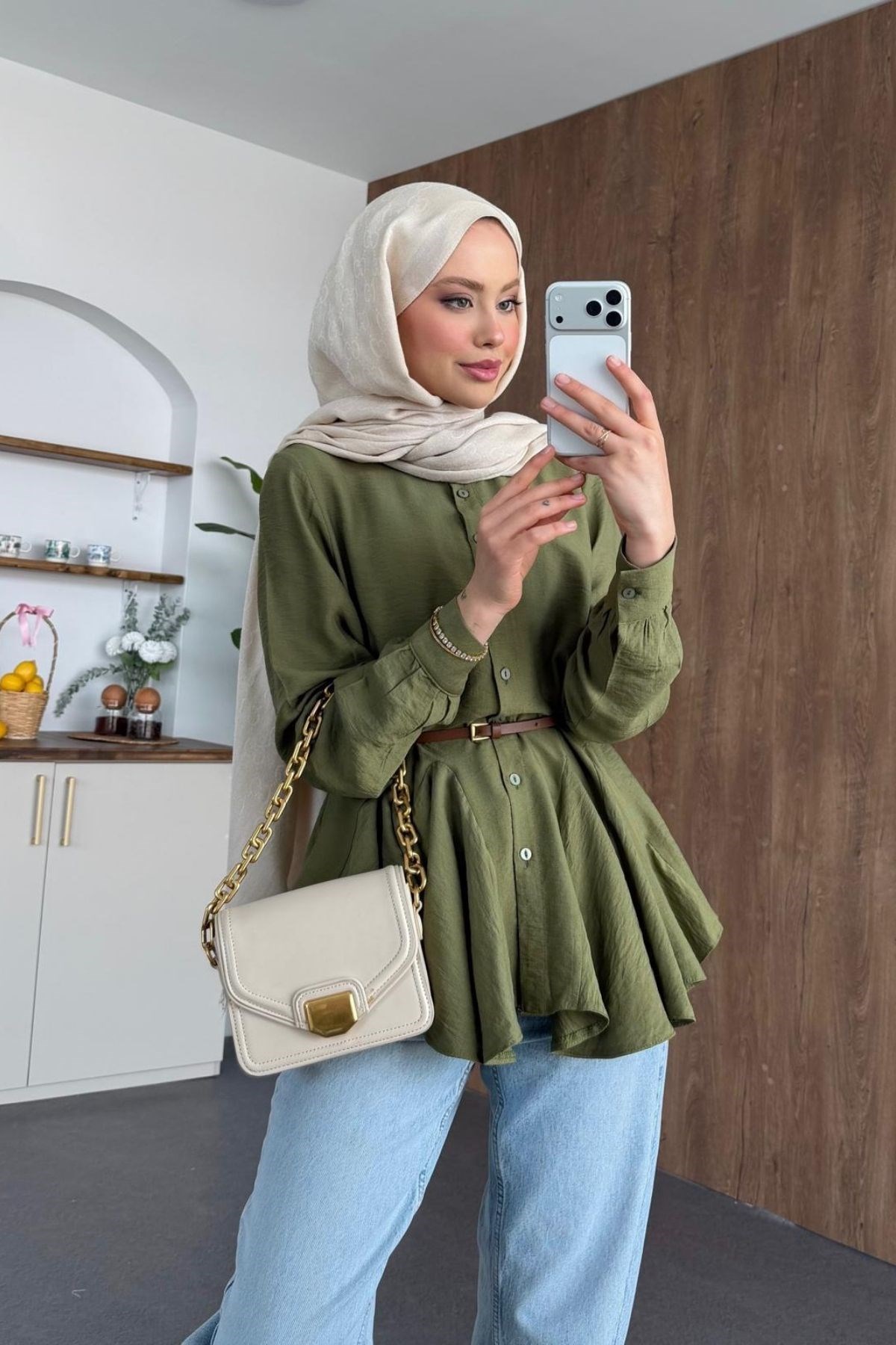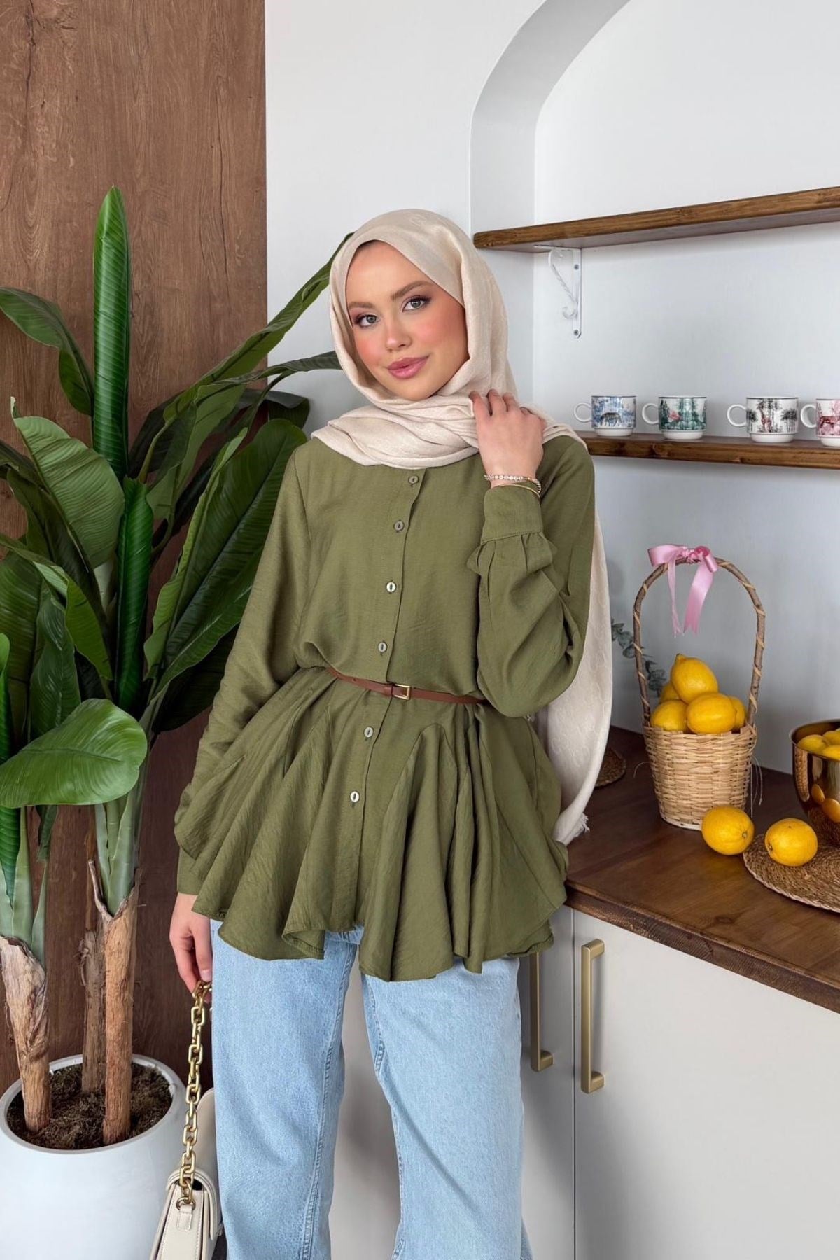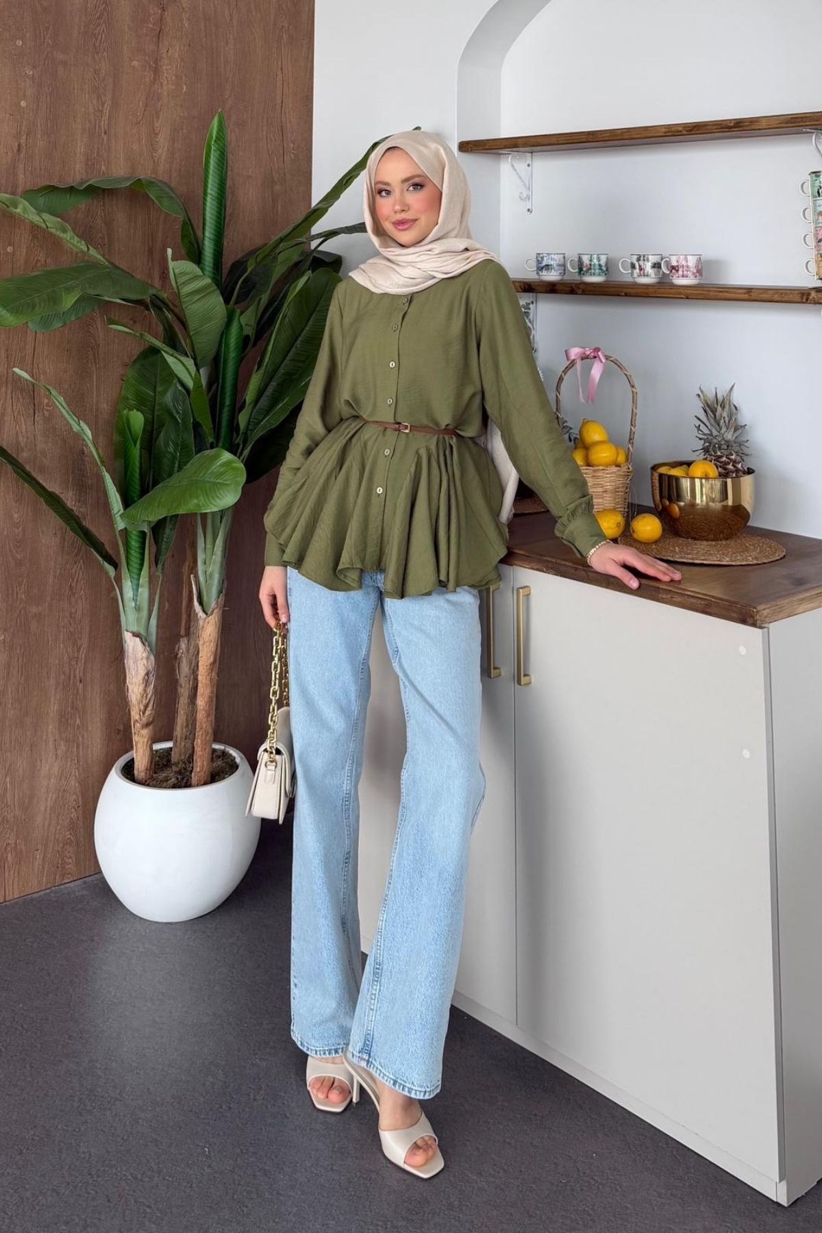 Ürün ince keten kumaştır. Ön formu düğmelidir bir adet biye kemeri mevcuttur.