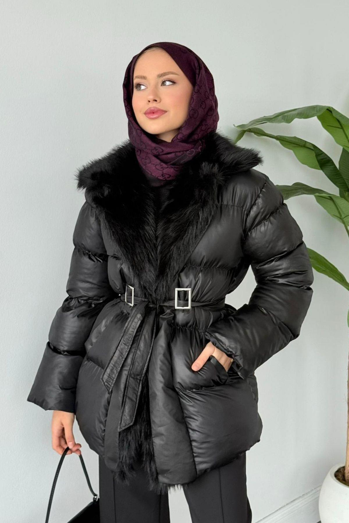 Look Şişme Kürklü Mont Siyah (8931)