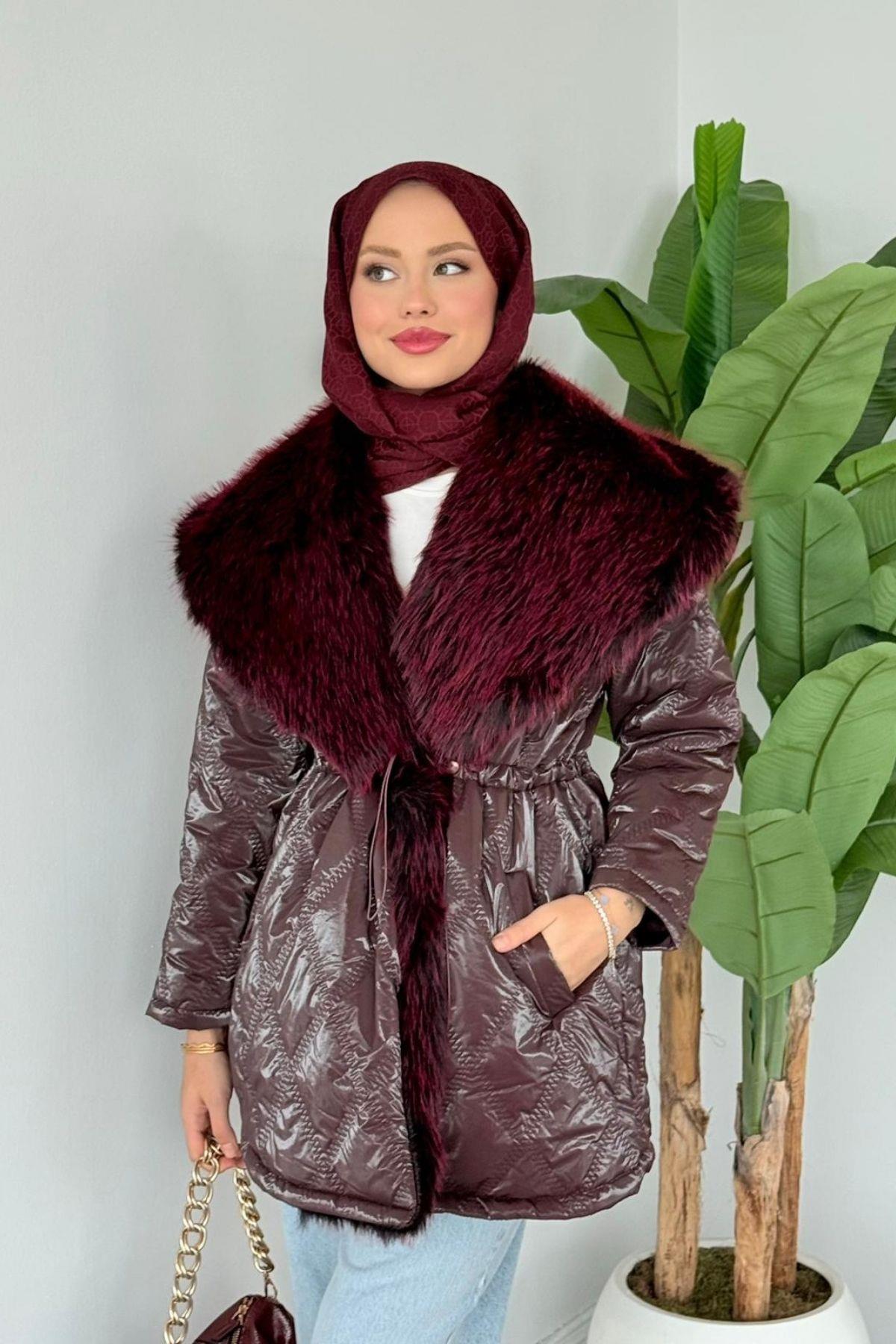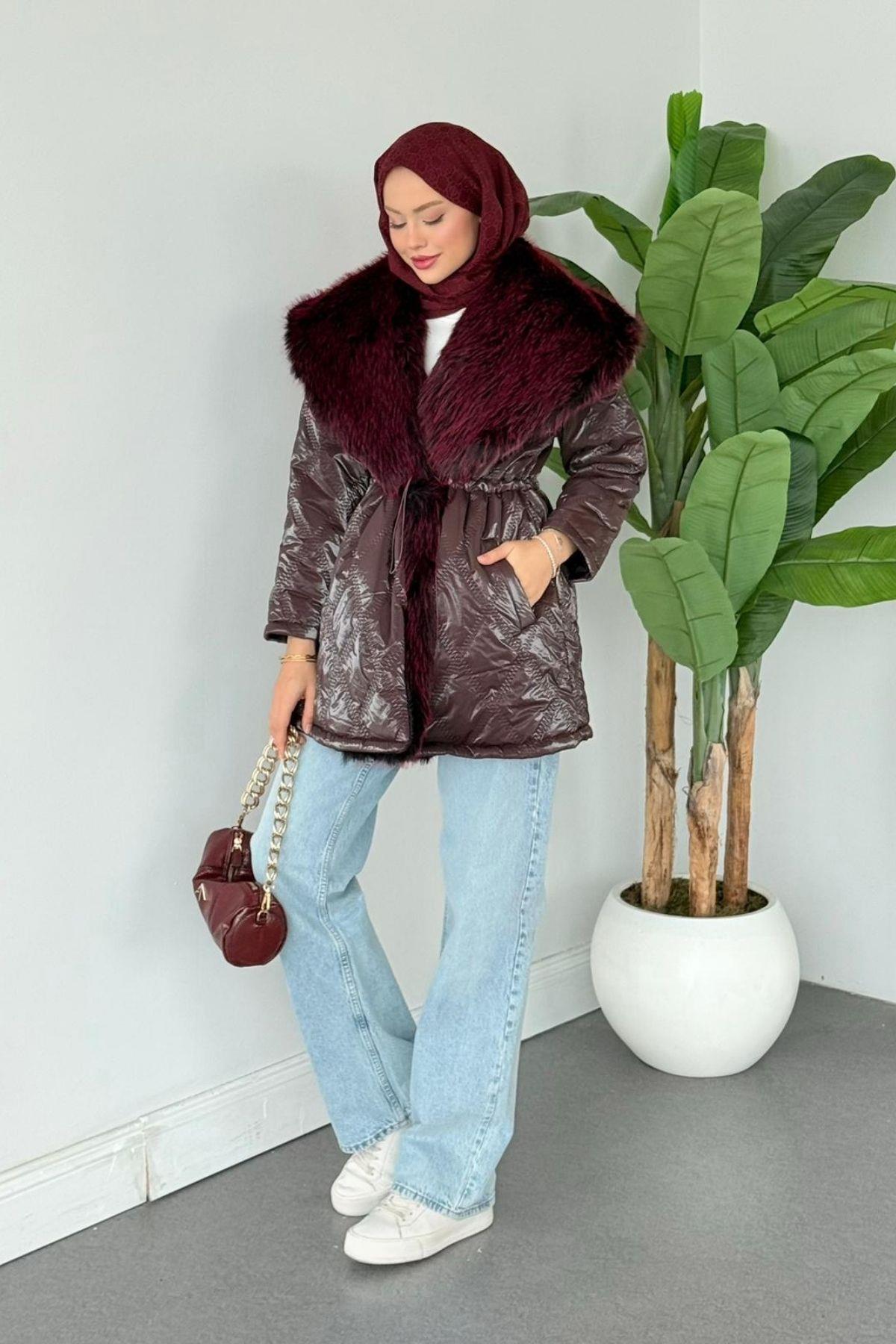 Ürün parlak kapitonedir içi astarlıdır yaka kısmı şal şeklinde olup kürk detaylıdır belden sıkma formundadır.