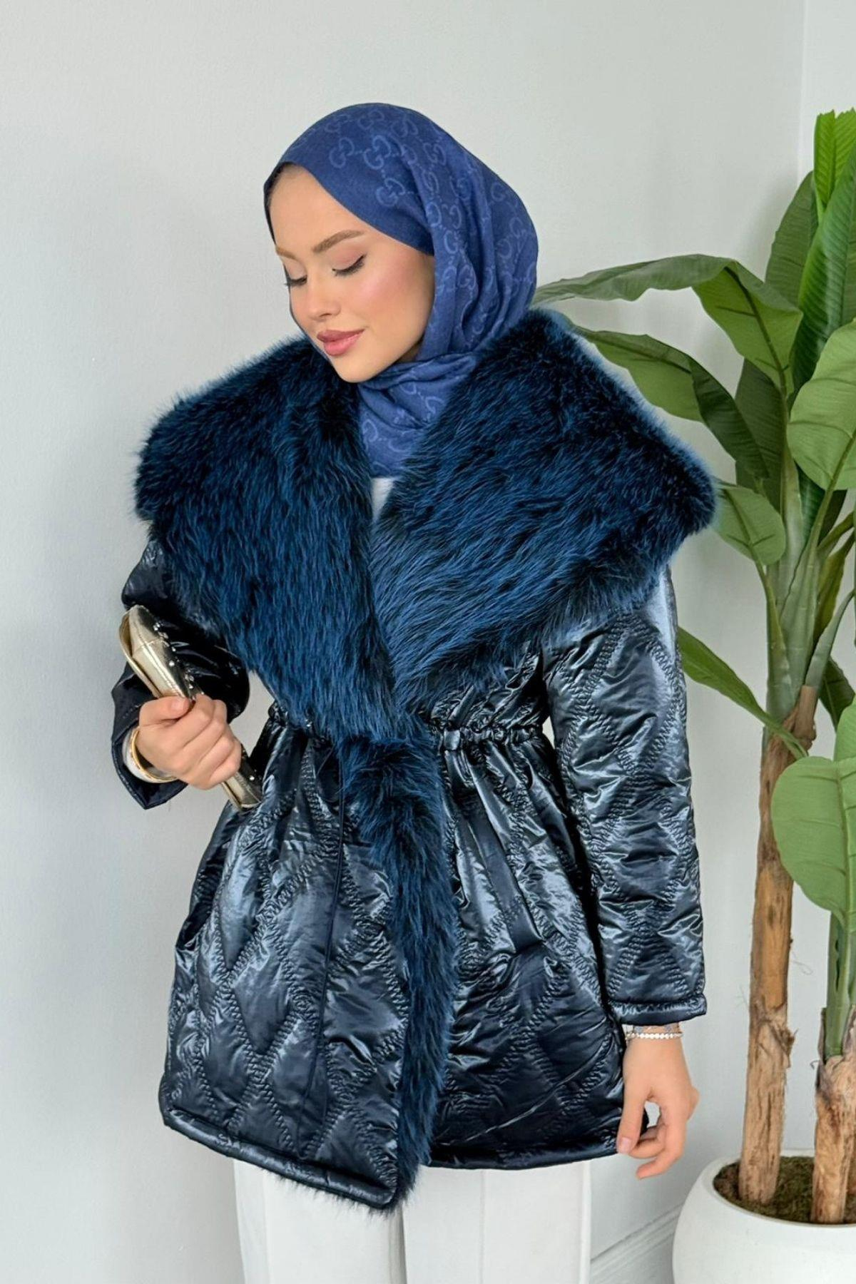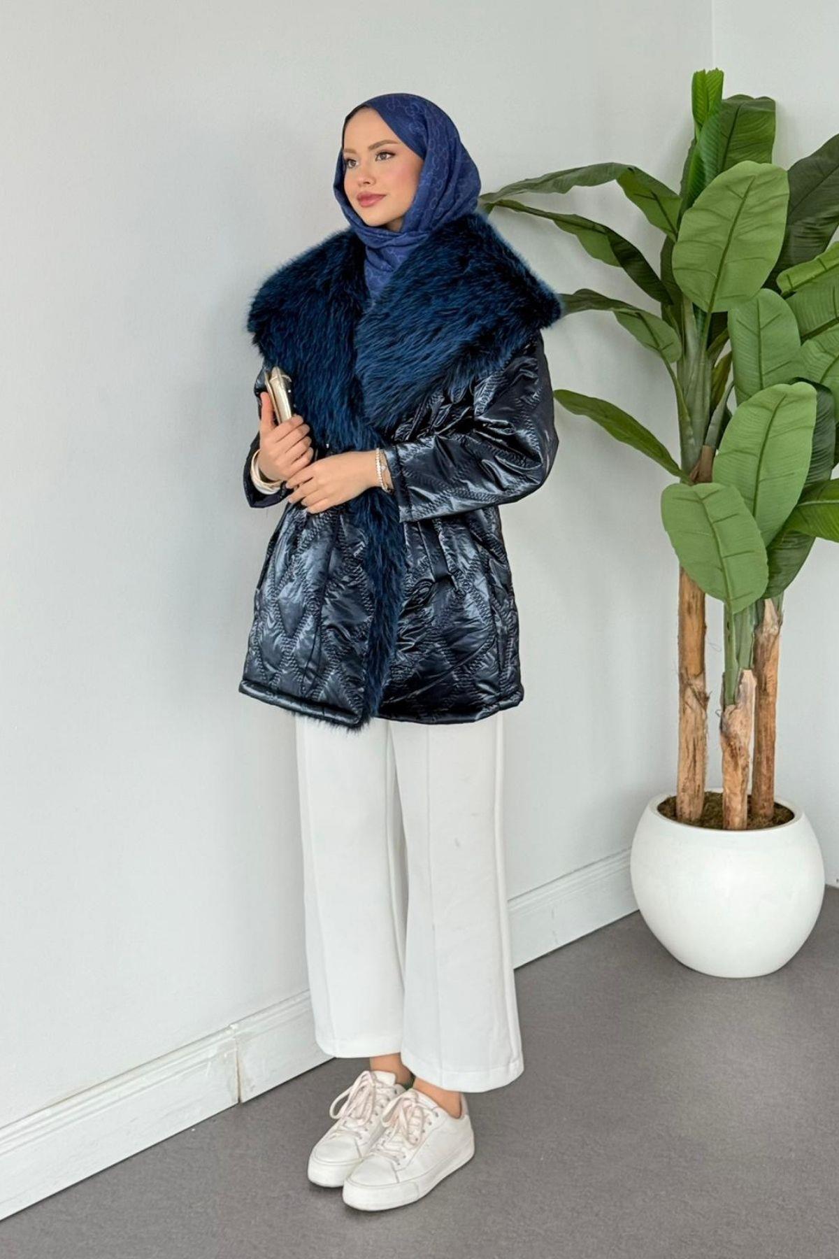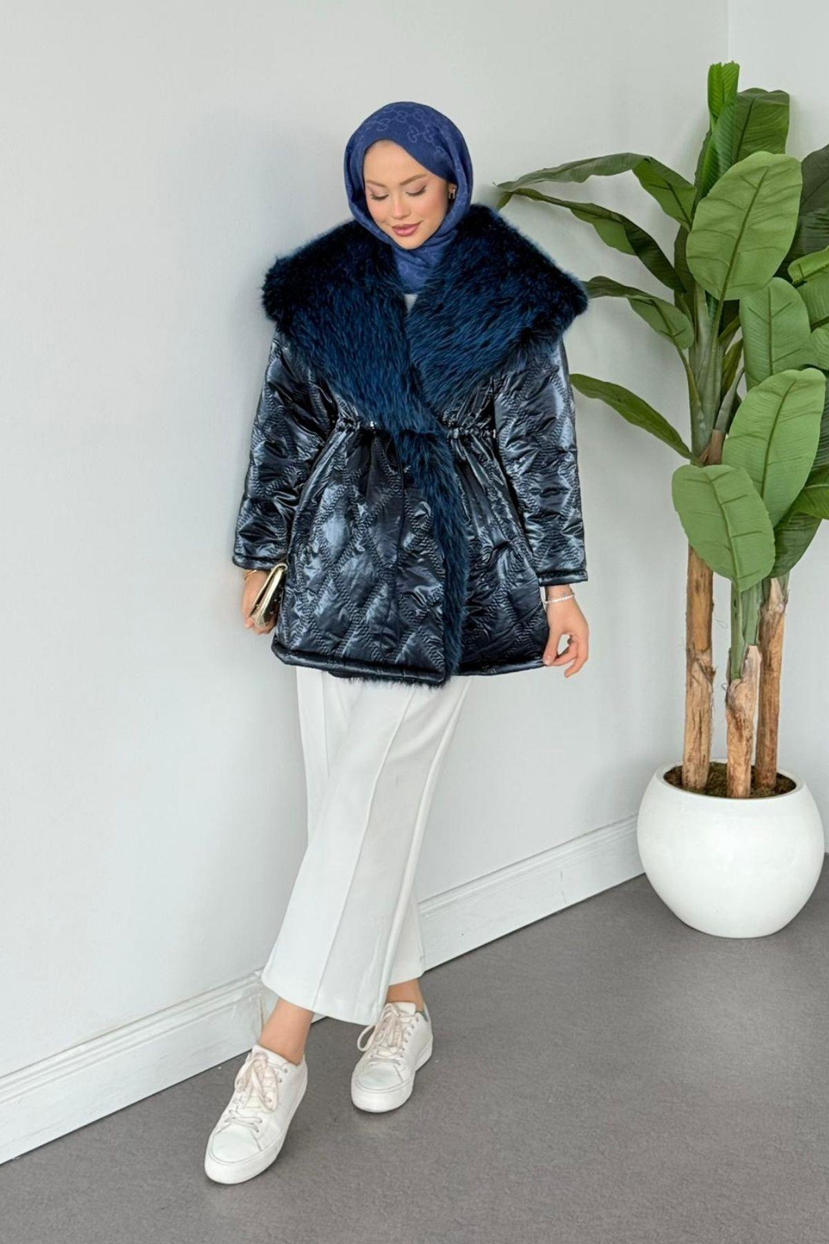 Qua Kürklü Parlak Mont Lacivert (6171)