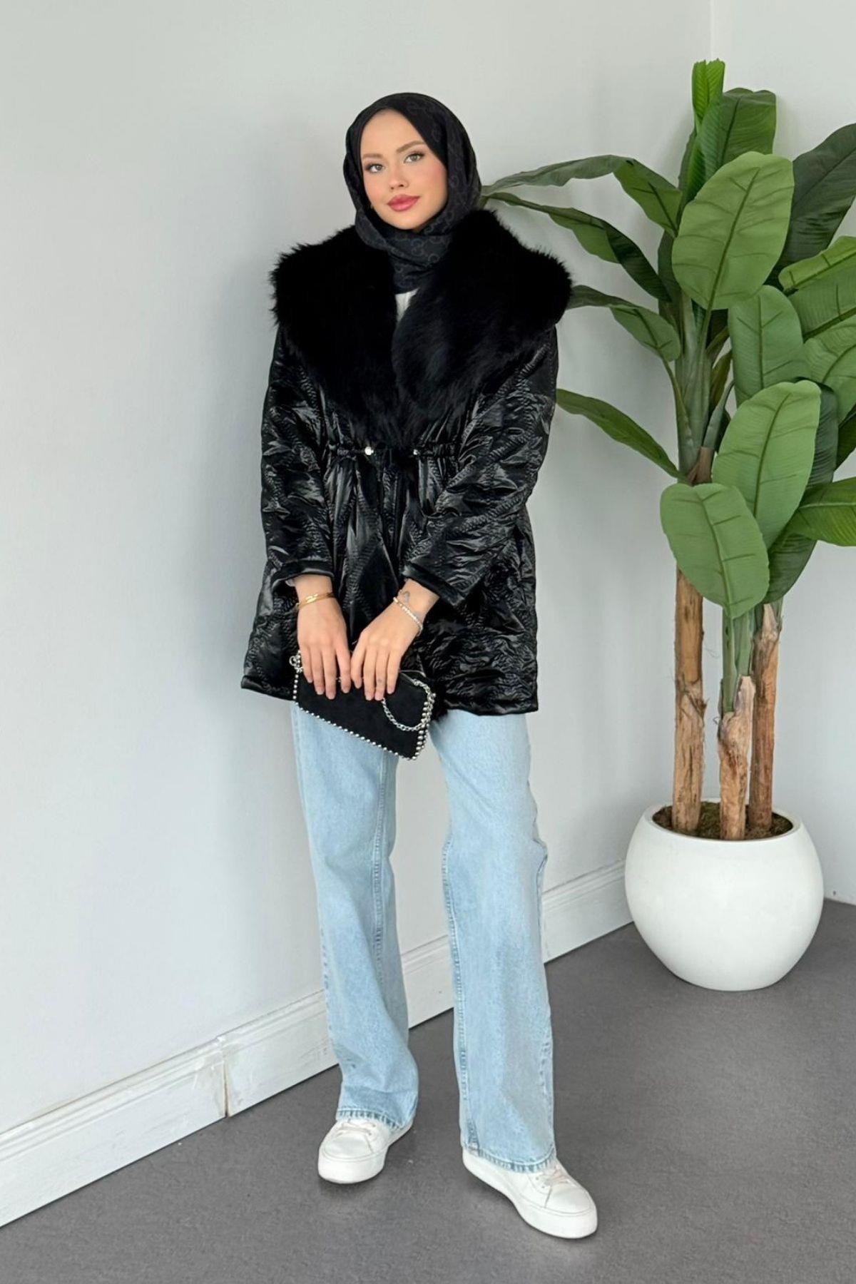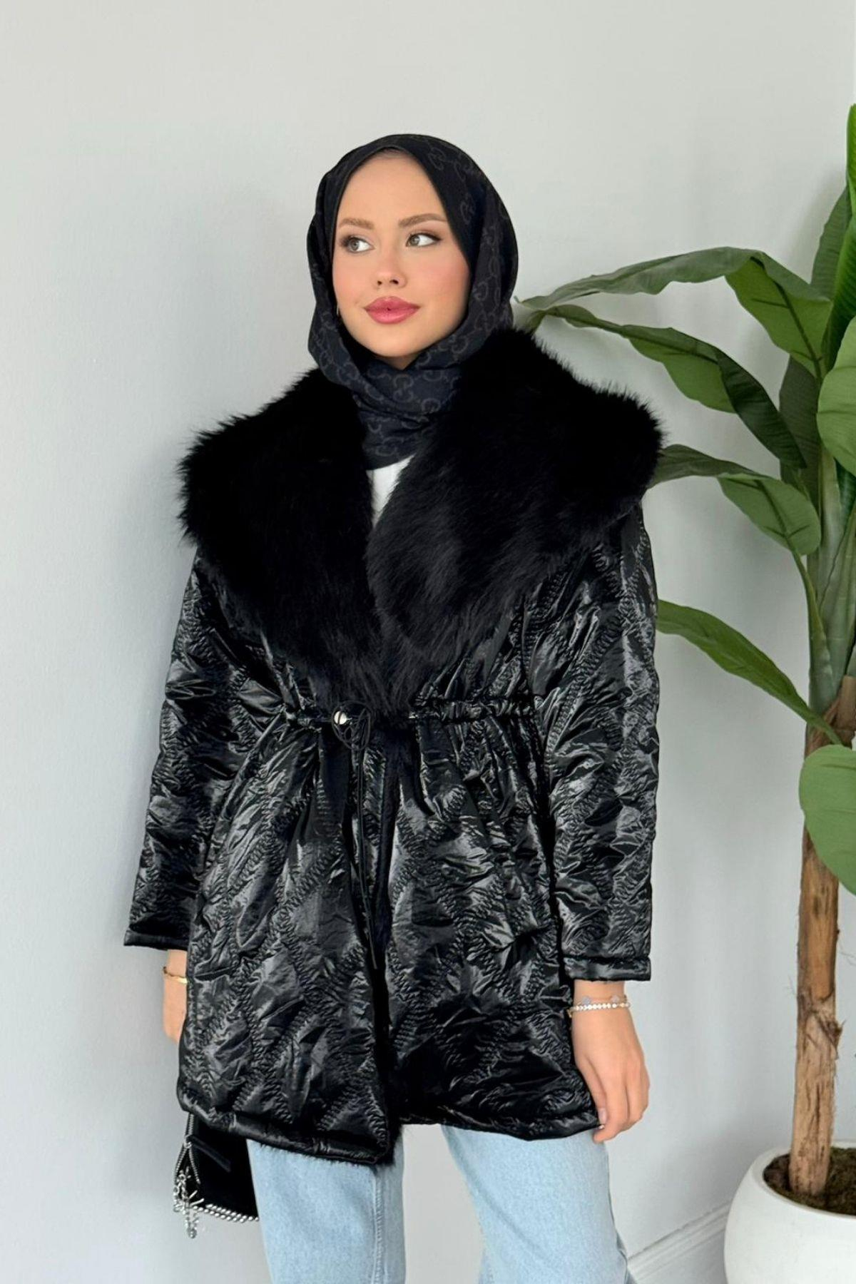 Ürün parlak kapitonedir içi astarlıdır yaka kısmı şal şeklinde olup kürk detaylıdır belden sıkma formundadır.