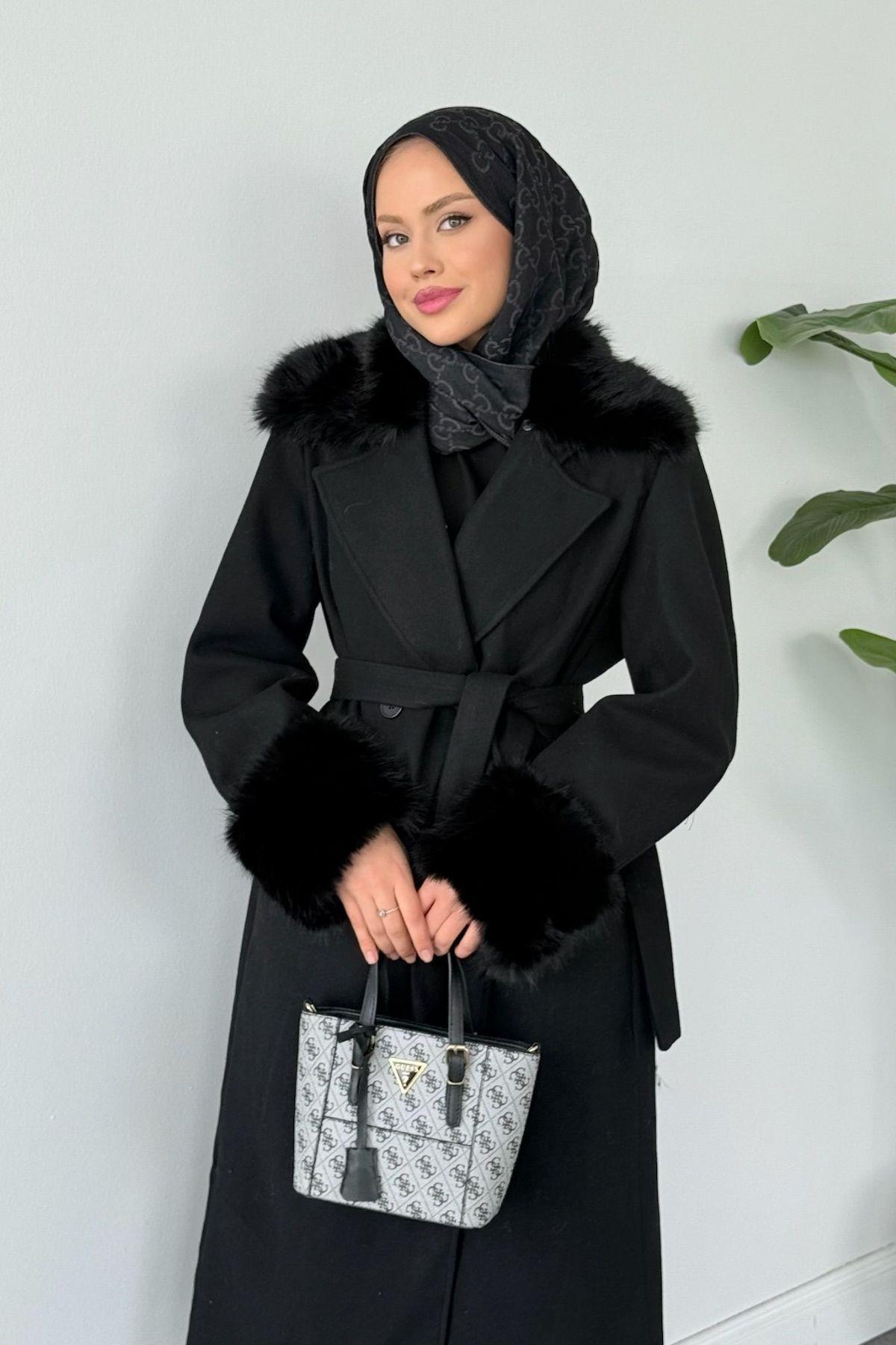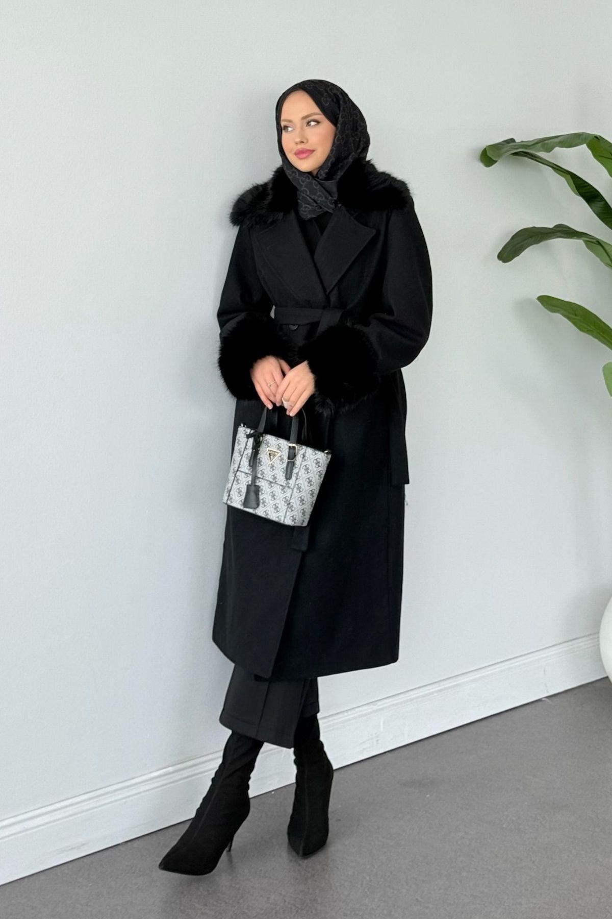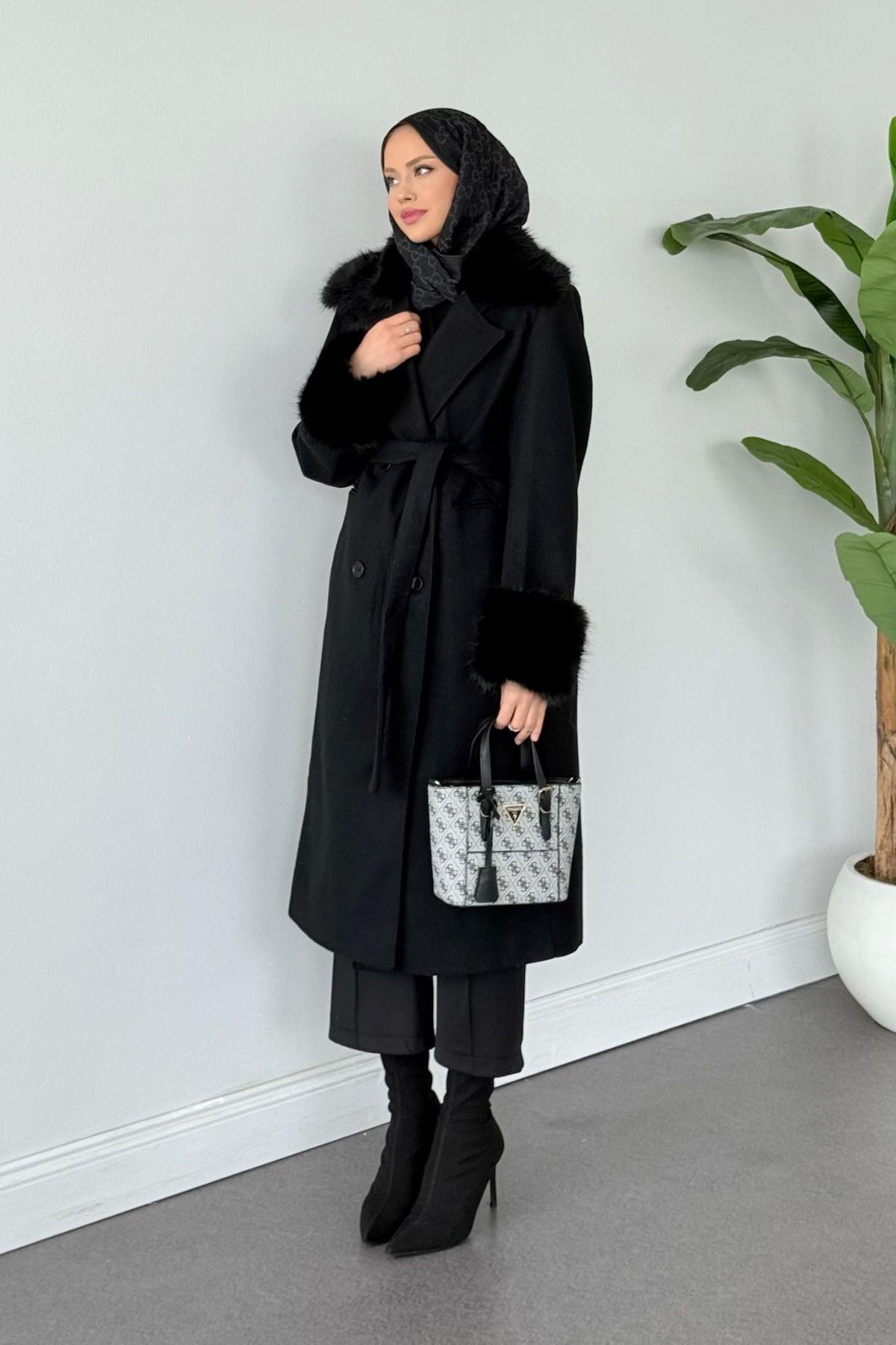 Gece Yakası Kürklü Kaban Siyah (51009)
