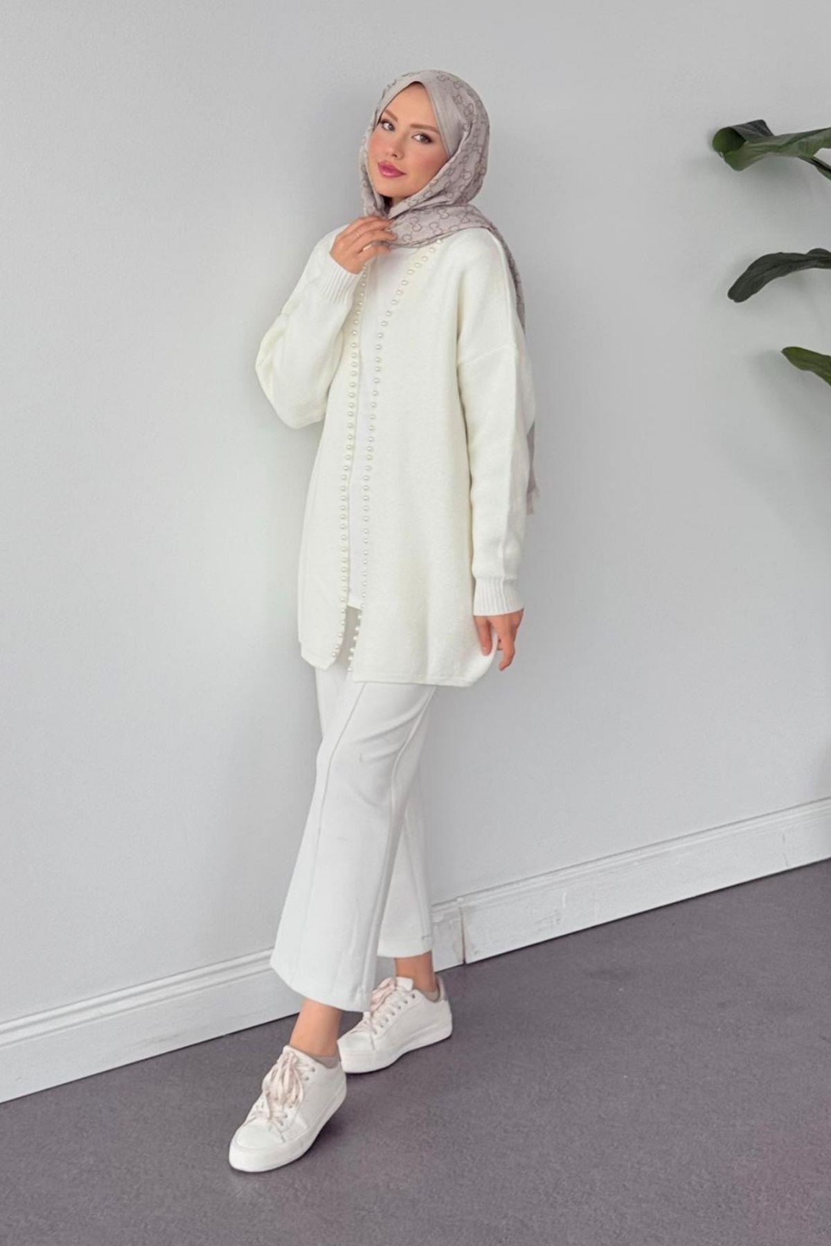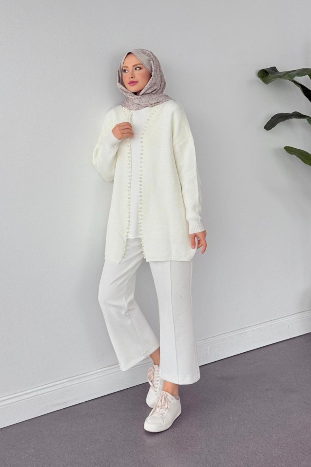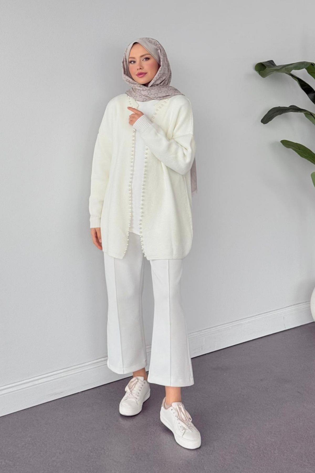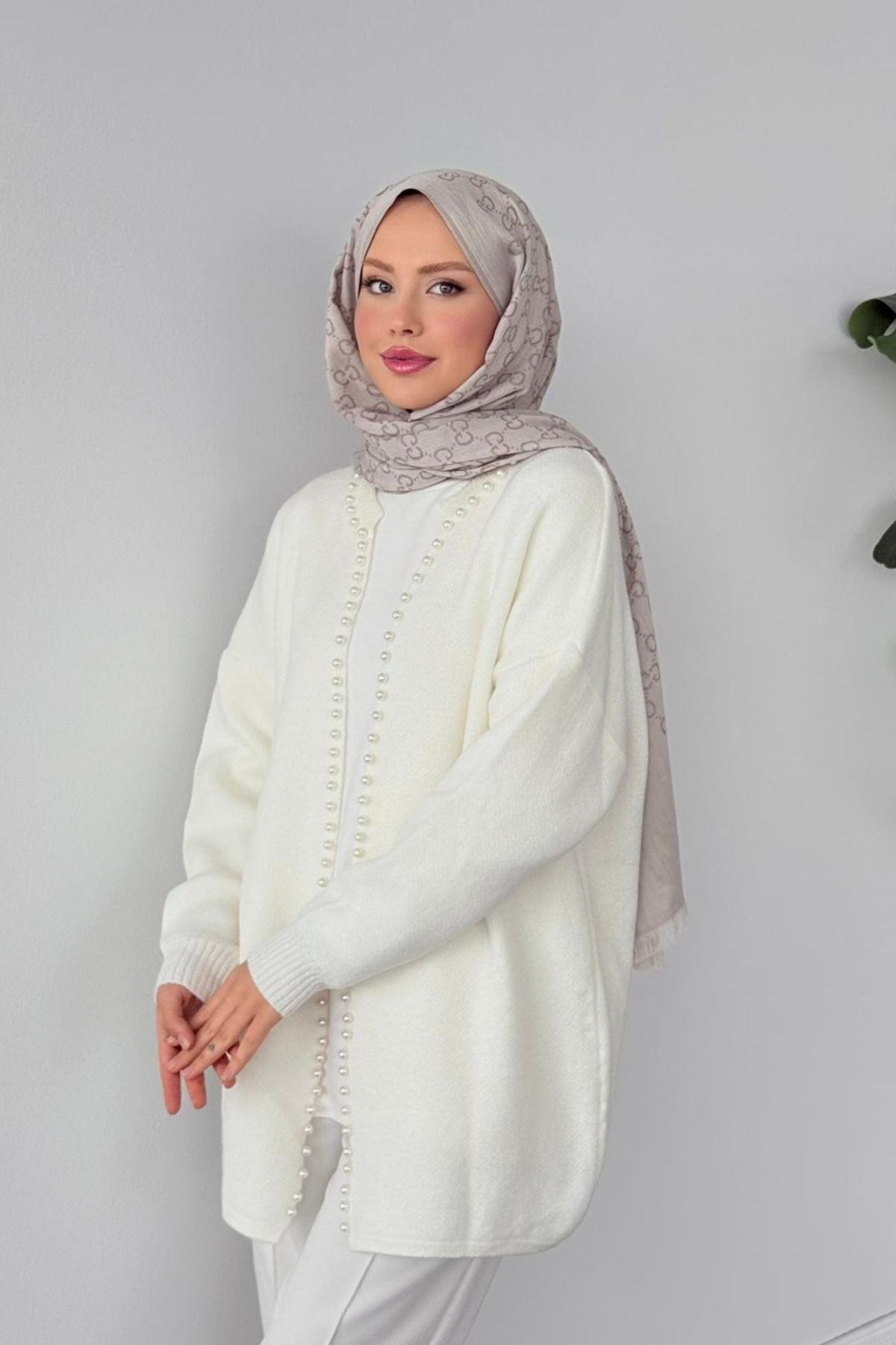 İnci Detaylı Hırka, sade triko dokusu üzerine işlenen inci detaylarıyla zarif bir şıklık sunar. Formunu kaybetmeyen yapısı ve iç göstermeyen dokusu ile dolabınızda hem işlevsel hem de stil sahibi bir tamamlayıcı parça olacaktır.