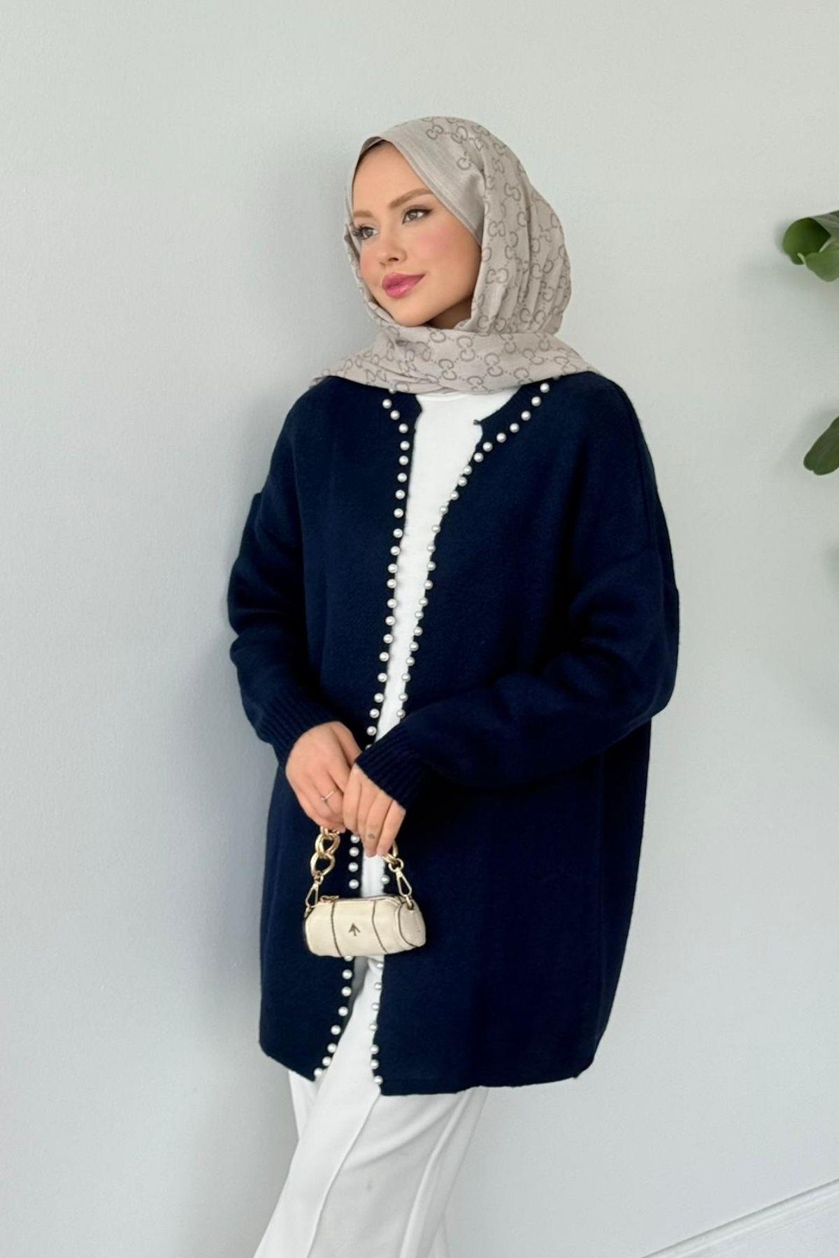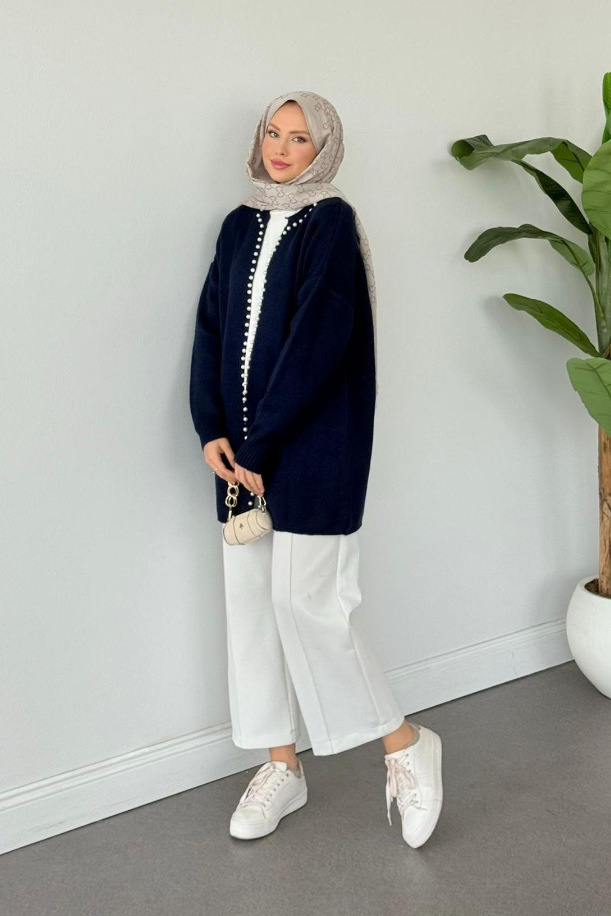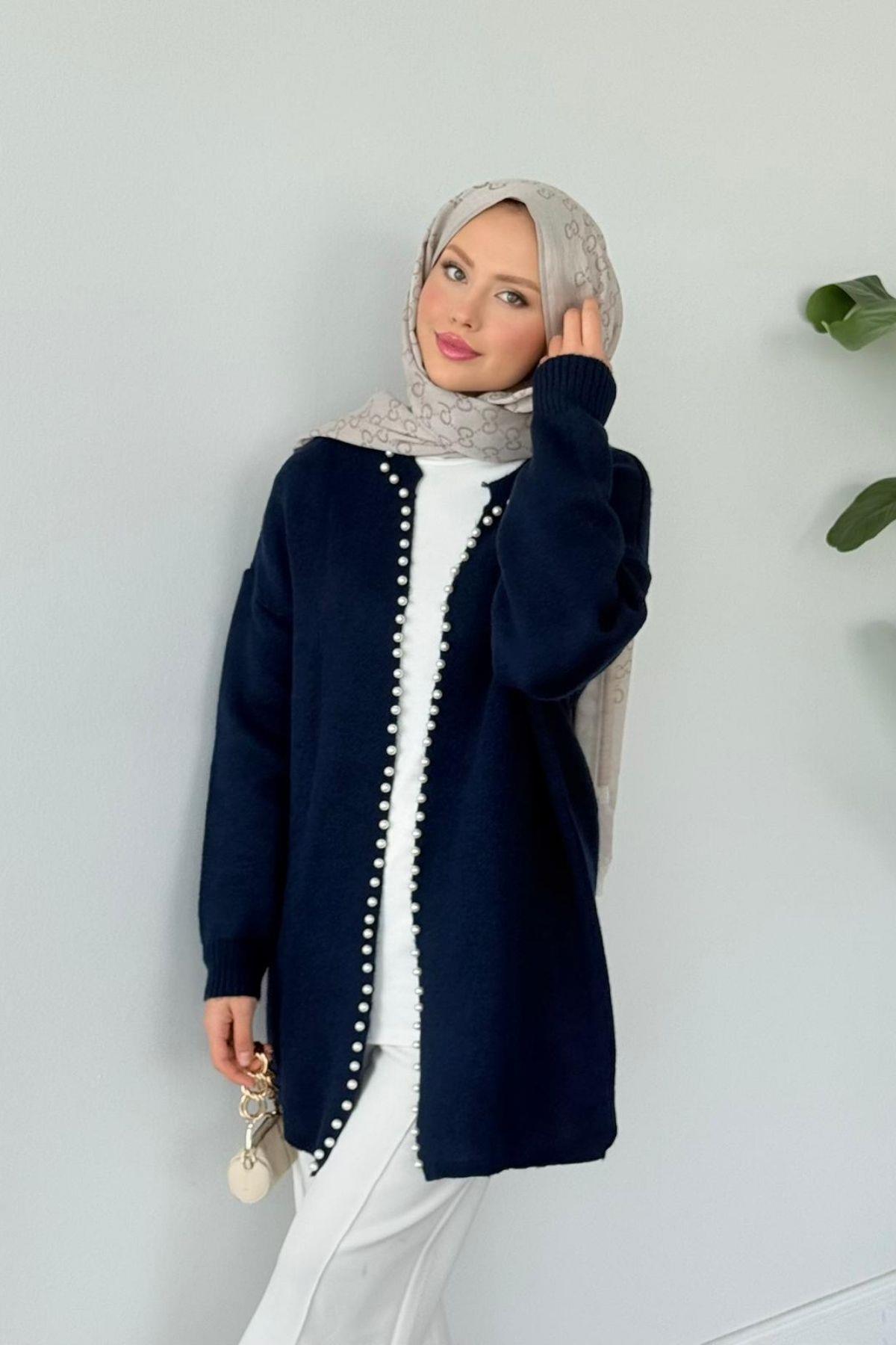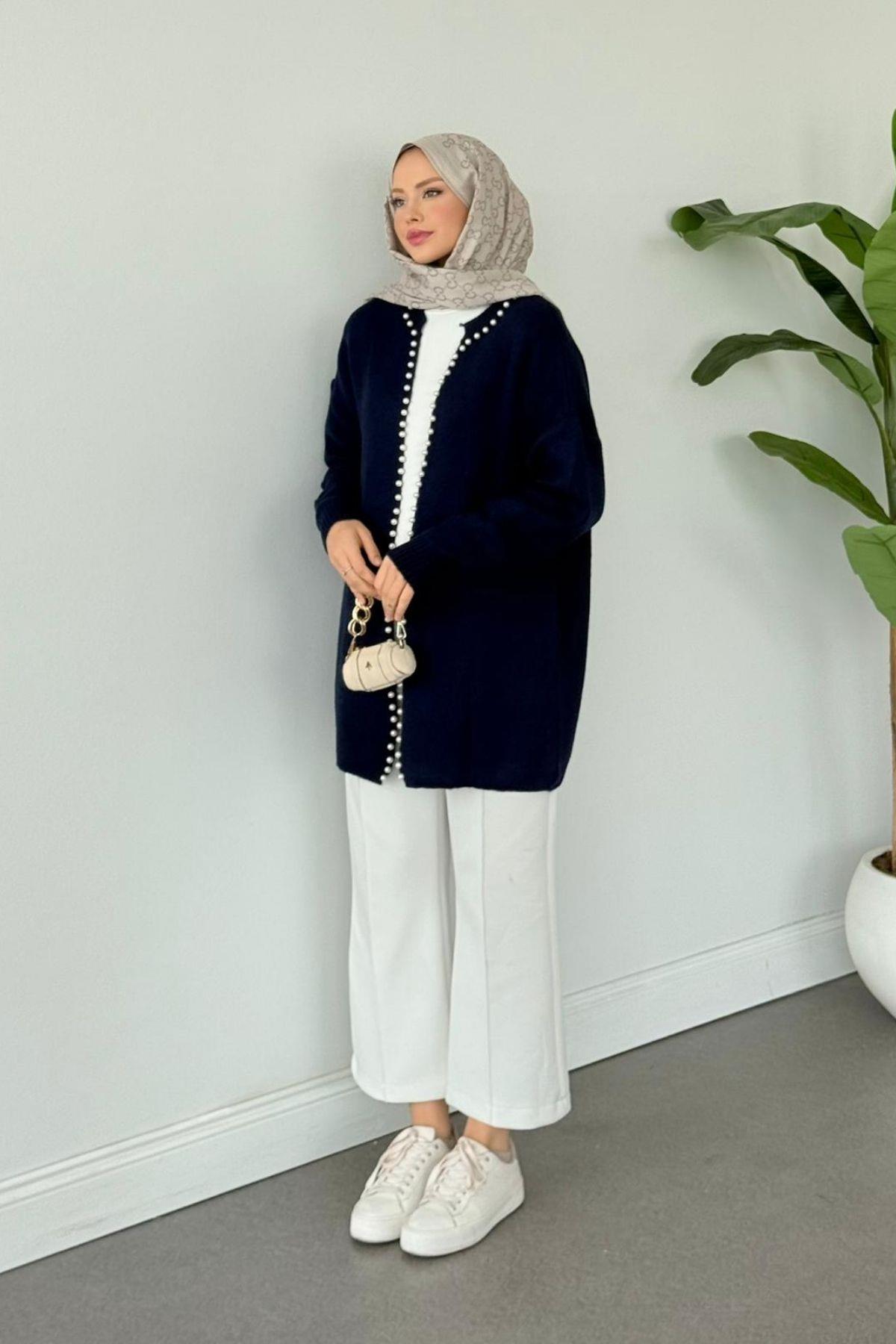 İnci Detaylı Hırka, sade triko dokusu üzerine işlenen inci detaylarıyla zarif bir şıklık sunar. Formunu kaybetmeyen yapısı ve iç göstermeyen dokusu ile dolabınızda hem işlevsel hem de stil sahibi bir tamamlayıcı parça olacaktır.