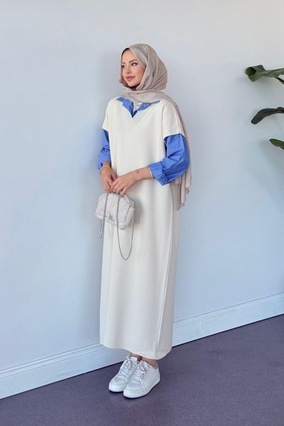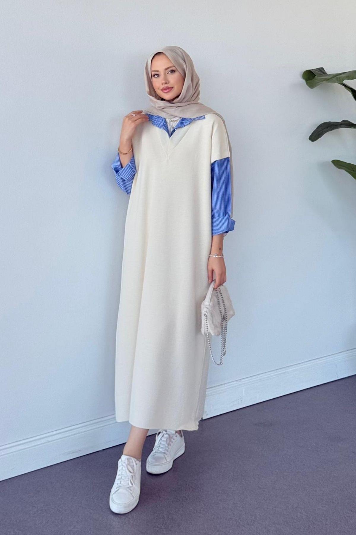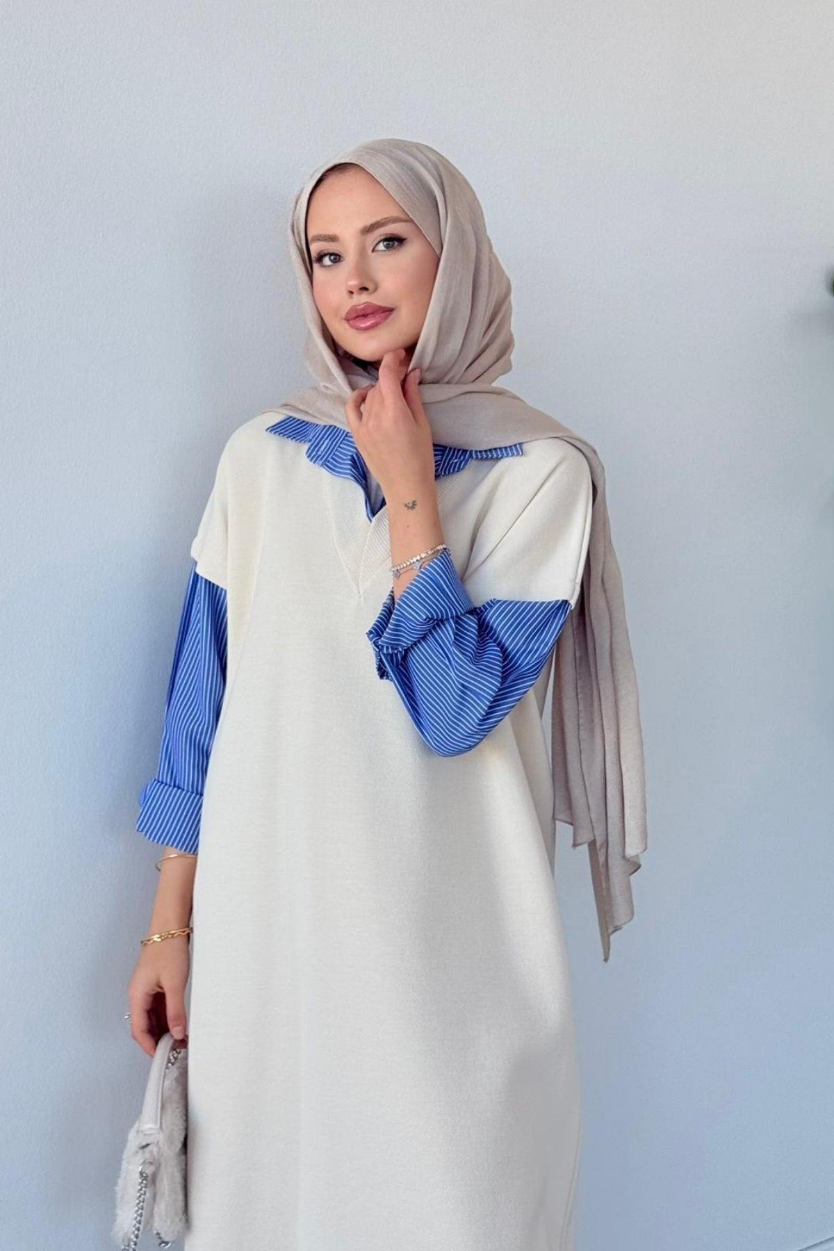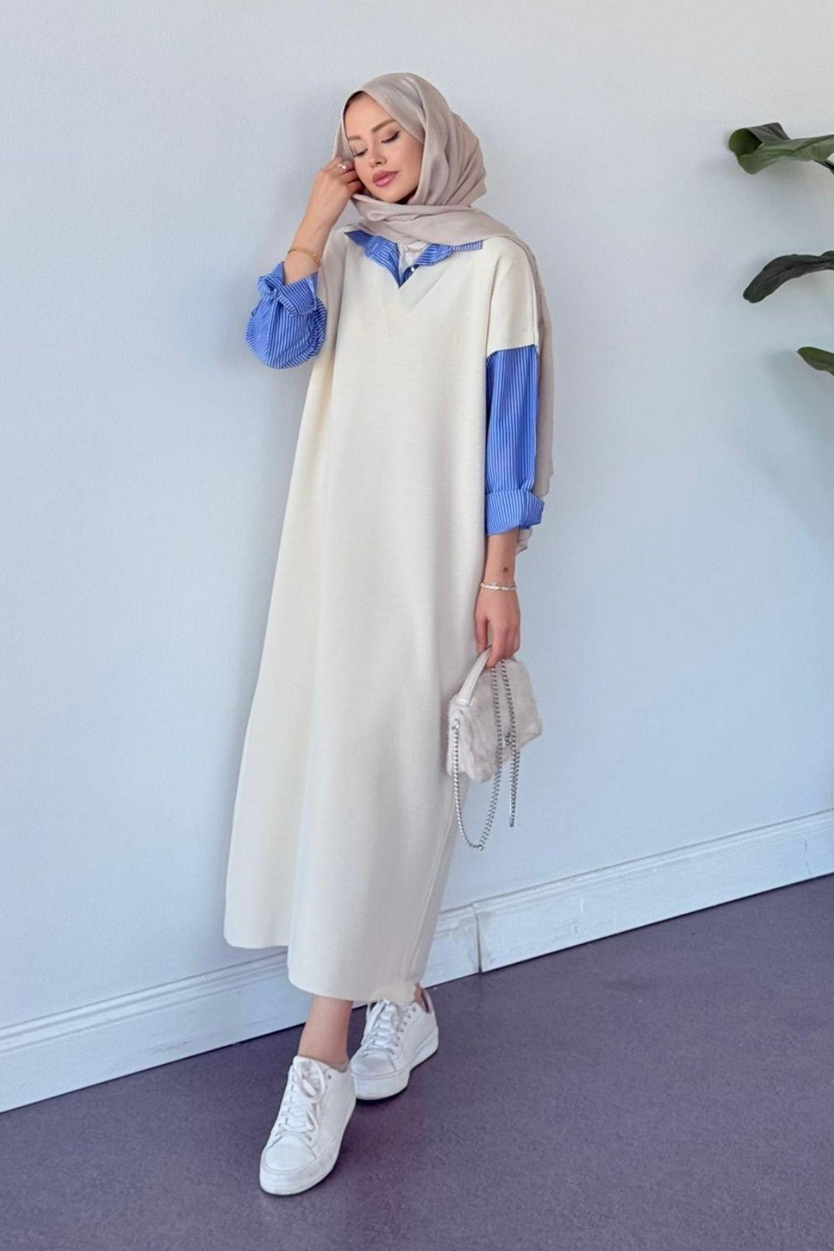 Muadil Elbise, poplin kol ve yaka detayları ile şıklığı, triko kumaşı ile ise konforu bir araya getiriyor. Modern ve zarif tasarımı ile hem günlük hayatta hem de özel davetlerde şıklığınızı tamamlayacak ideal bir parça.