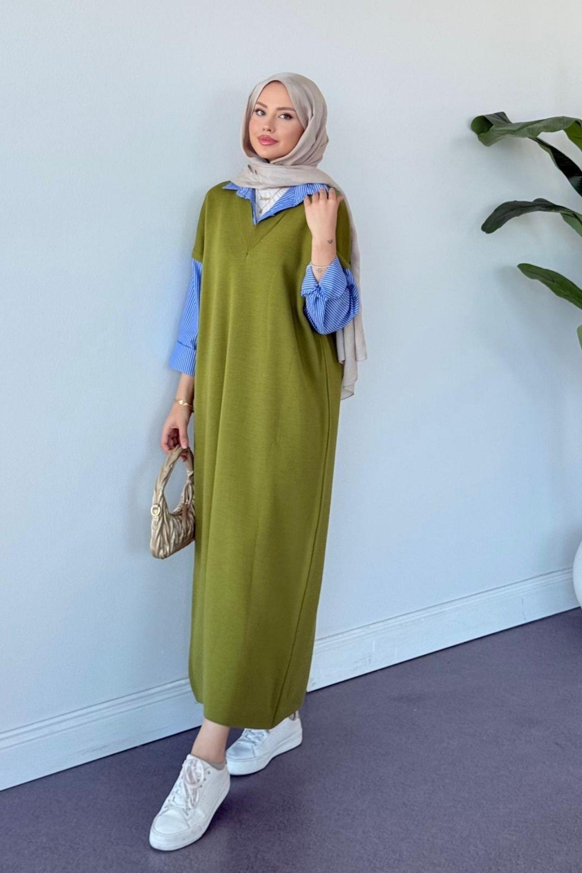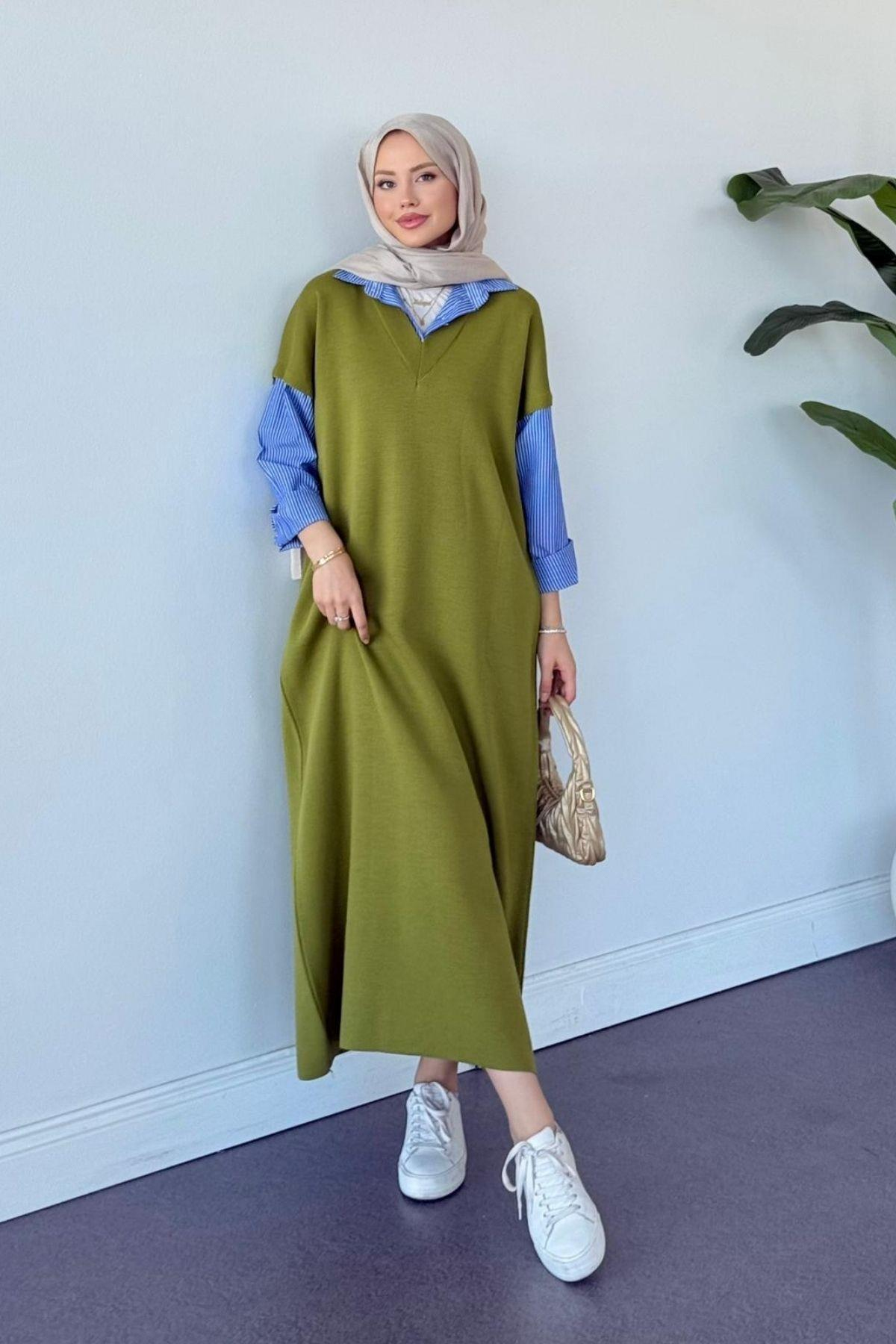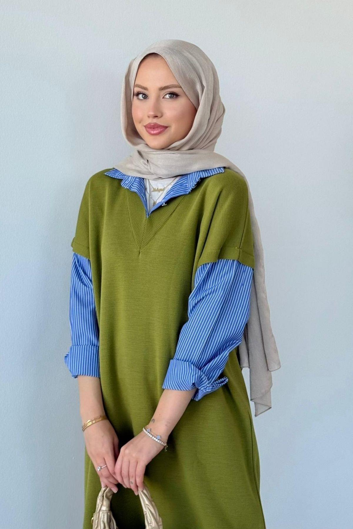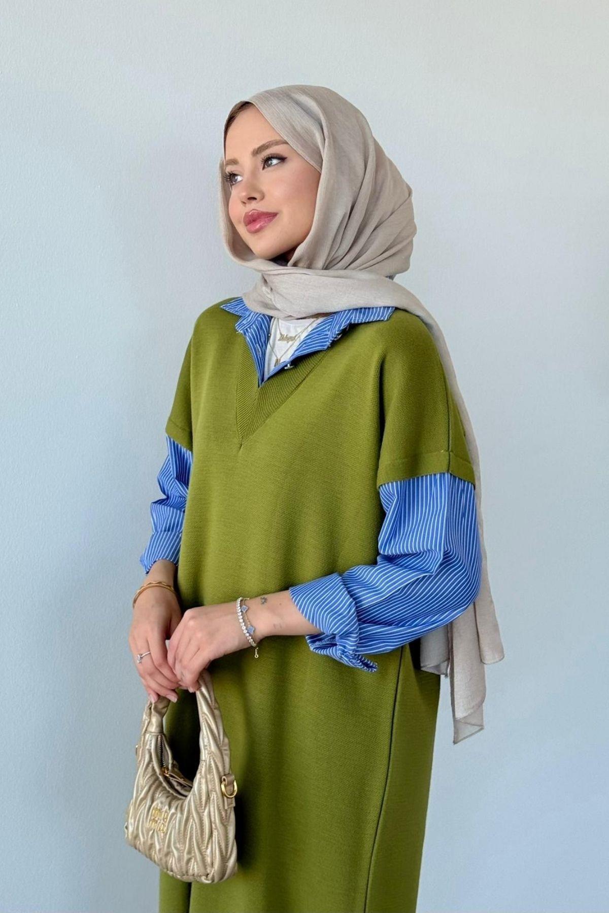 Muadil Elbise, poplin kol ve yaka detayları ile şıklığı, triko kumaşı ile ise konforu bir araya getiriyor. Modern ve zarif tasarımı ile hem günlük hayatta hem de özel davetlerde şıklığınızı tamamlayacak ideal bir parça.