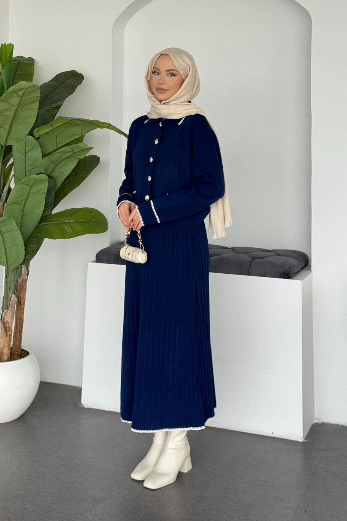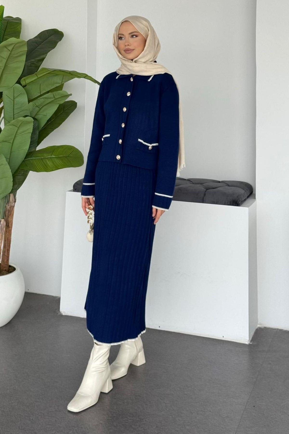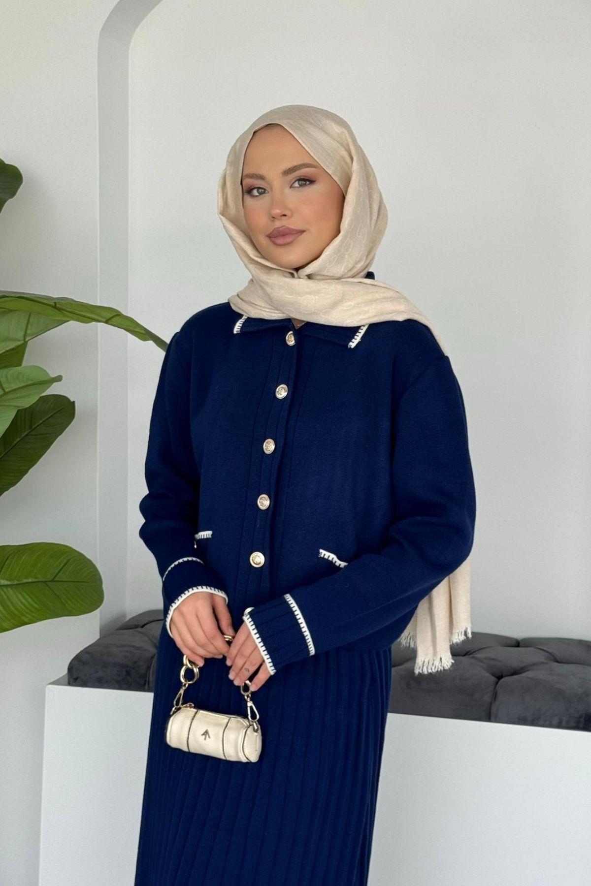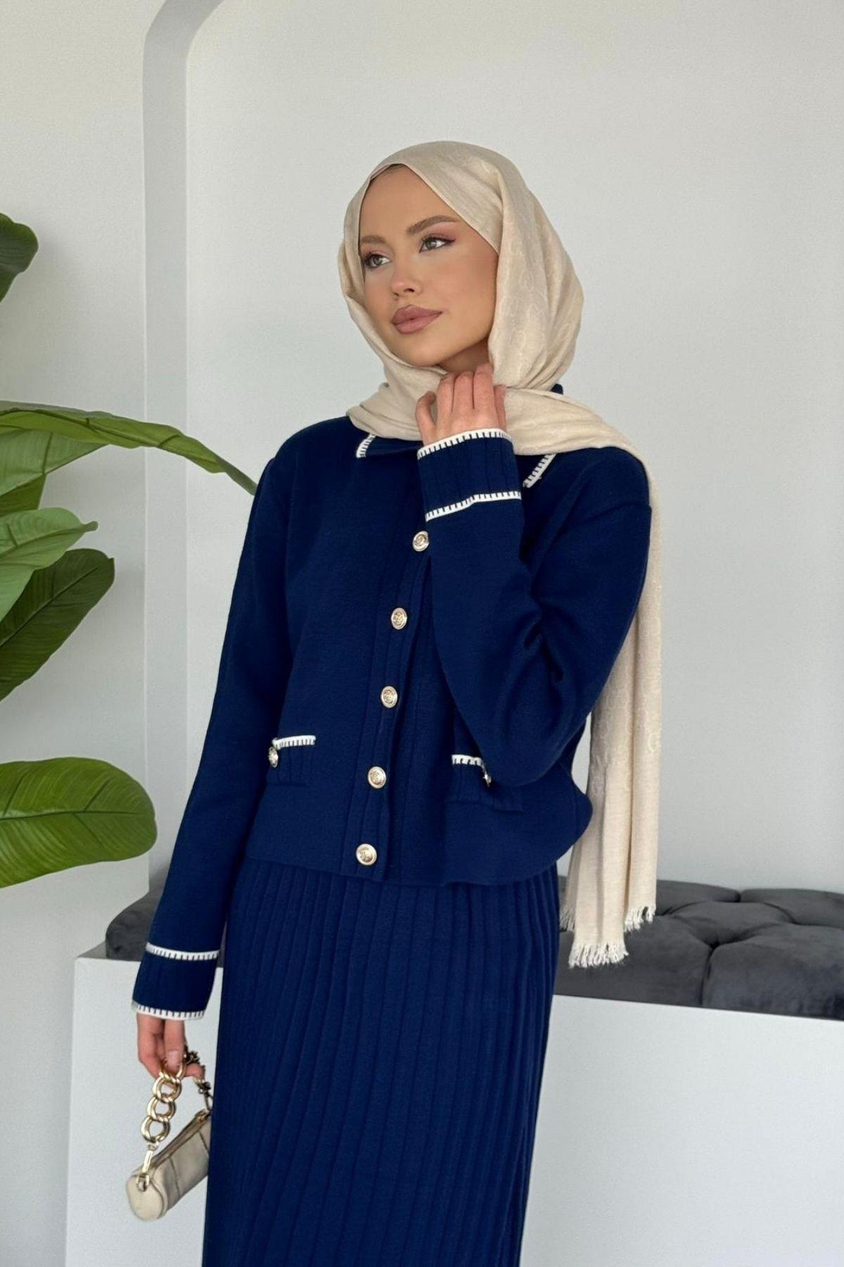 Ürün ikili triko takımdan oluşmaktadır üst formunda düğme detayı mevcuttur  iç göstermez tiftiklenme yapmaz.